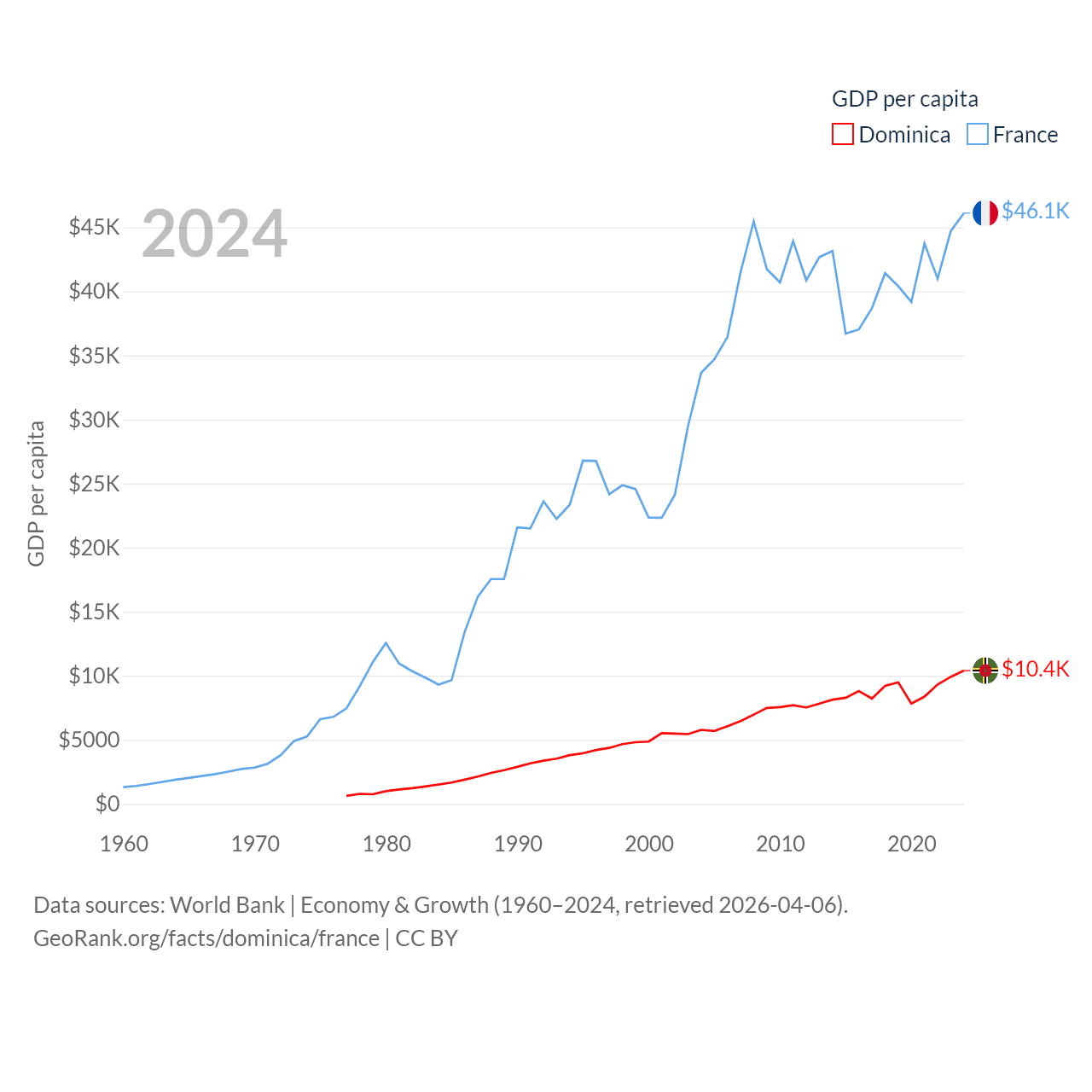 By GDP, Dominica ranks 190/197 ($689M) and France ranks 7/197 ($3.16T). By GDP per capita, Dominica ranks 84/197 ($10,405), while France ranks 27/197 ($46,103).