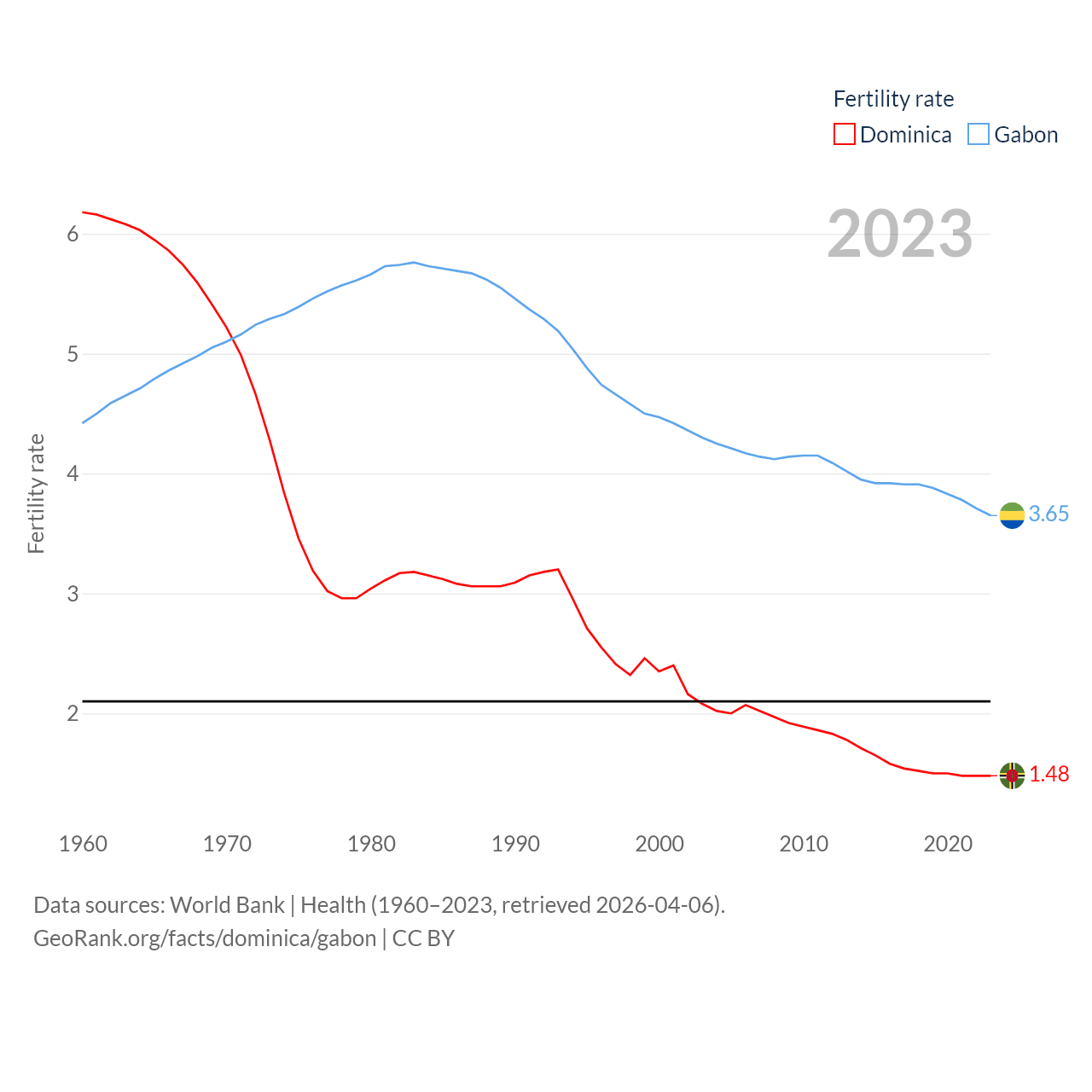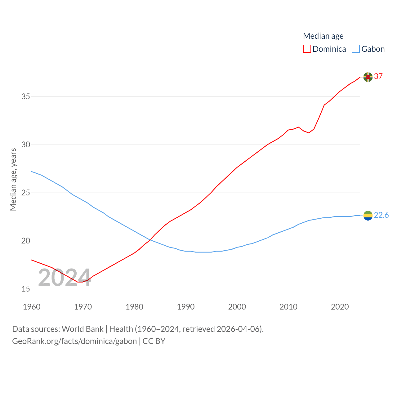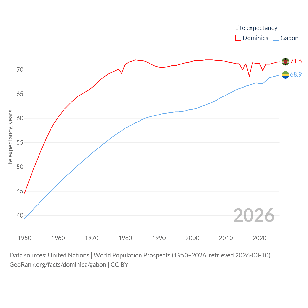 Dominica has a population of 66.2K (ranked 188/197), compared with 2.54M in Gabon (ranked 141/197). Dominica's land area is 289.6 sq mi versus 99,487 sq mi for Gabon (ranked 175th vs. 75th).