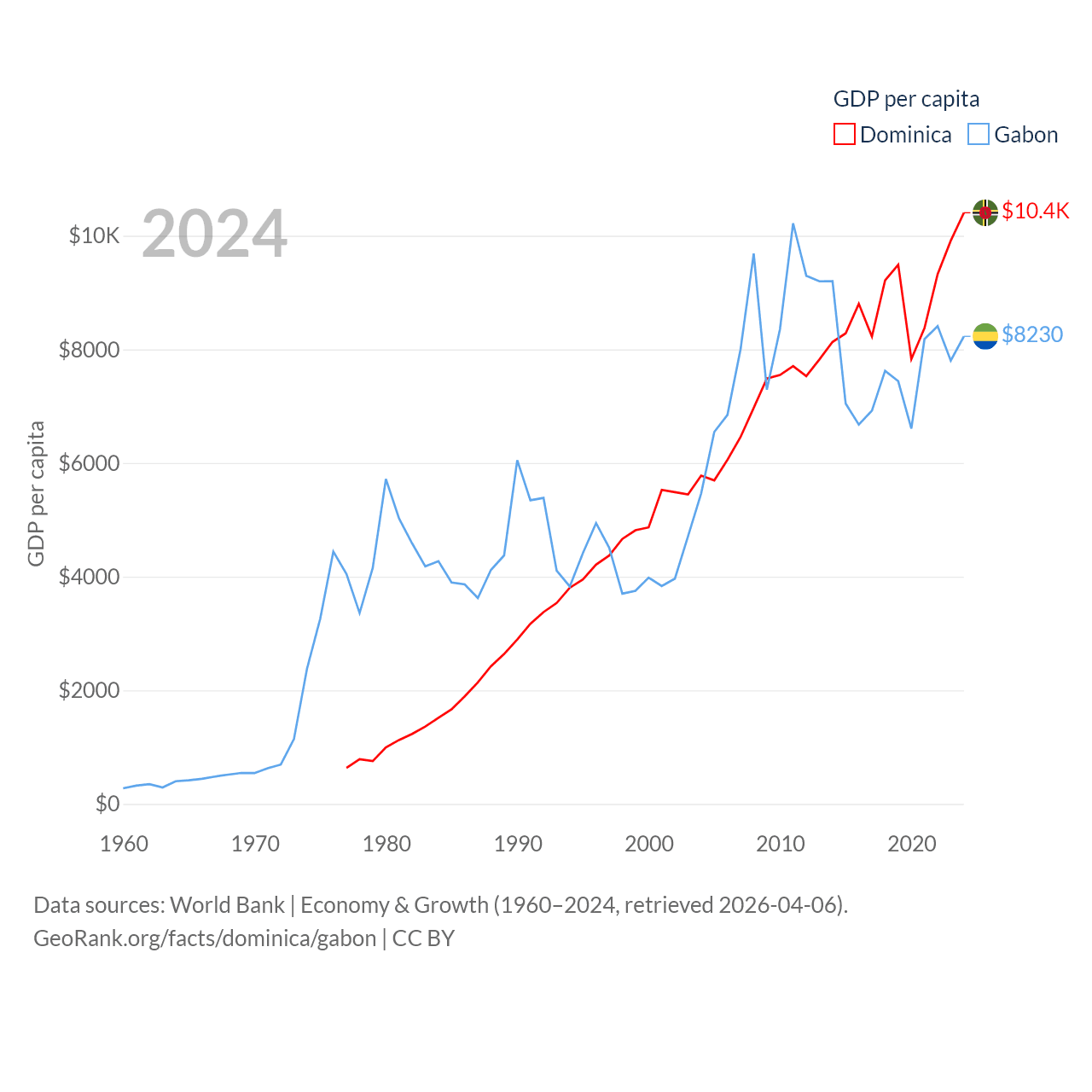 By GDP, Dominica ranks 190/197 ($689M) and Gabon ranks 127/197 ($20.9B). By GDP per capita, Dominica ranks 84/197 ($10,405), while Gabon ranks 93/197 ($8,230).