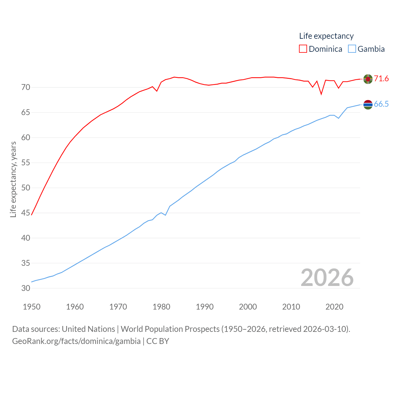 Dominica has a population of 66.2K (ranked 188/197), compared with 2.76M in The Gambia (ranked 140/197). Dominica's land area is 289.6 sq mi versus 3,907 sq mi for The Gambia (ranked 175th vs. 161st).