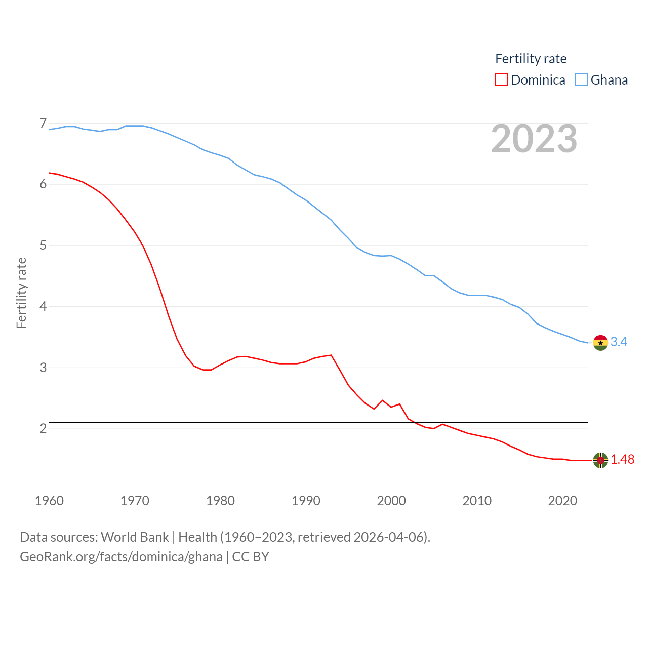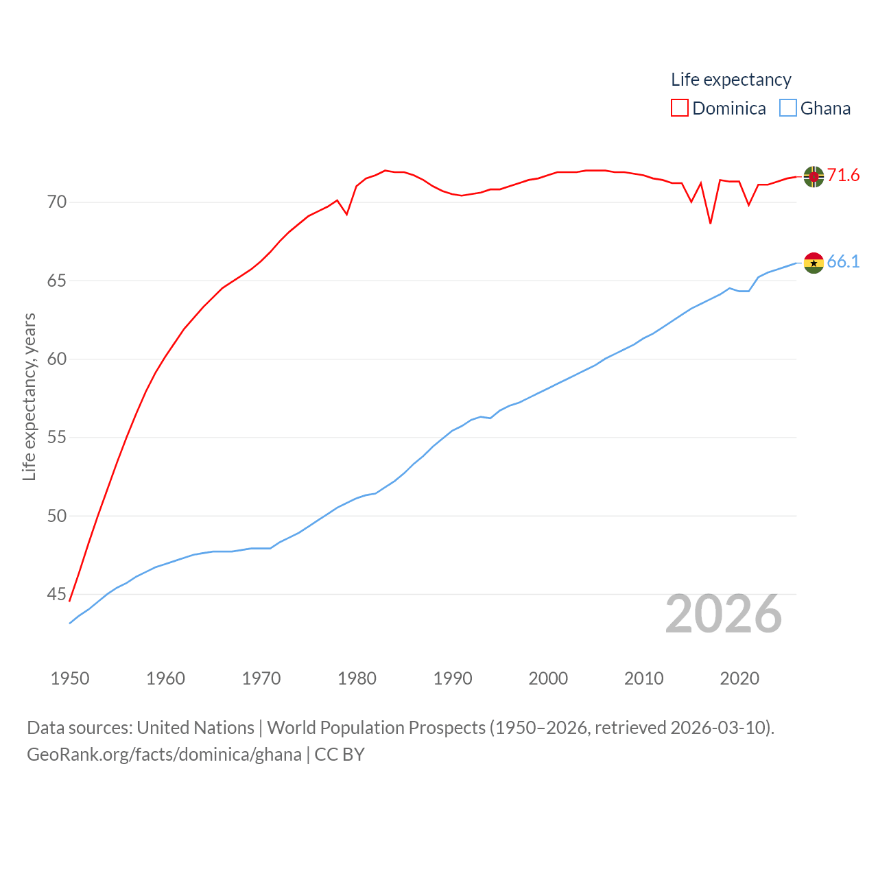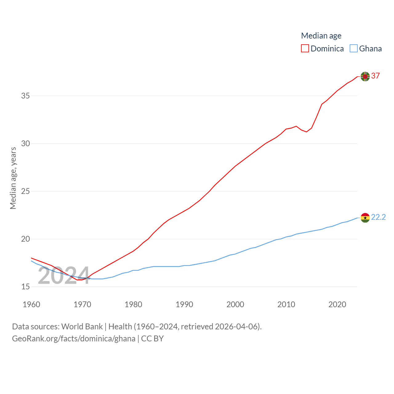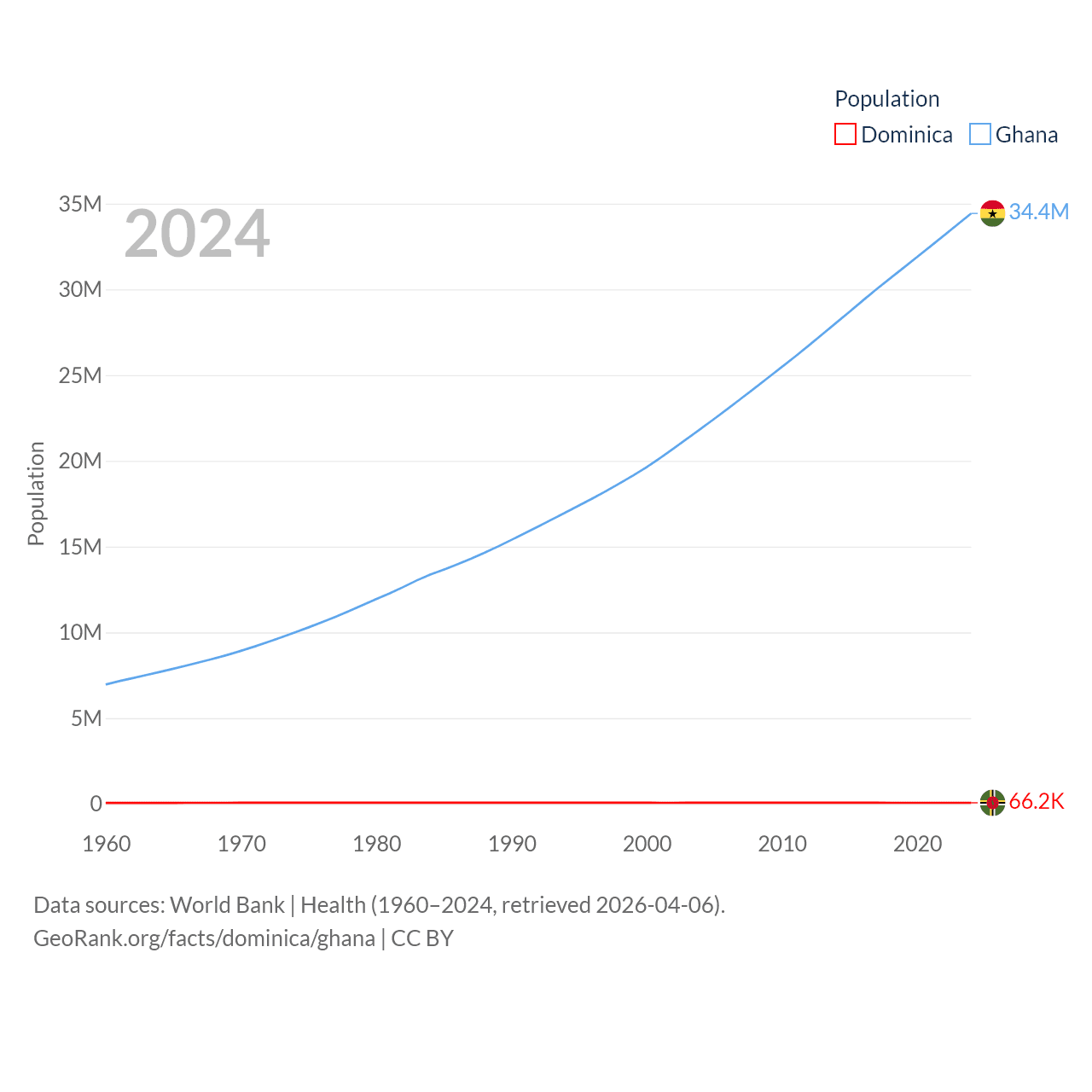 Dominica has a population of 66.2K (ranked 188/197), compared with 34.4M in Ghana (ranked 47/197). Dominica's land area is 289.6 sq mi versus 87,851 sq mi for Ghana (ranked 175th vs. 81st).