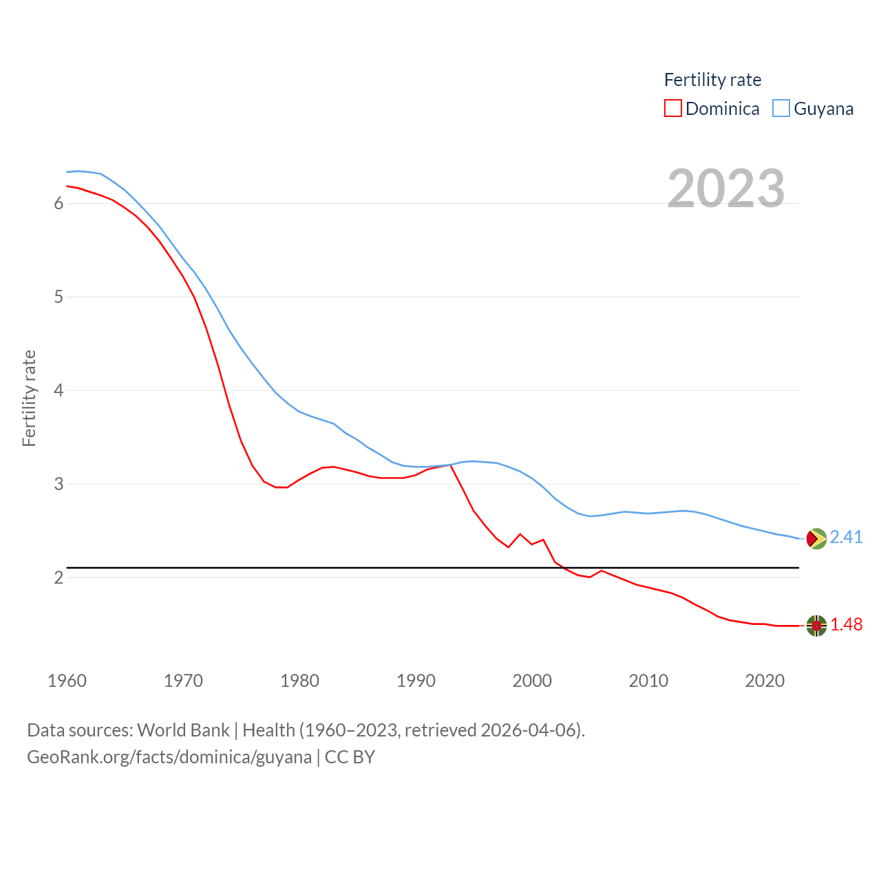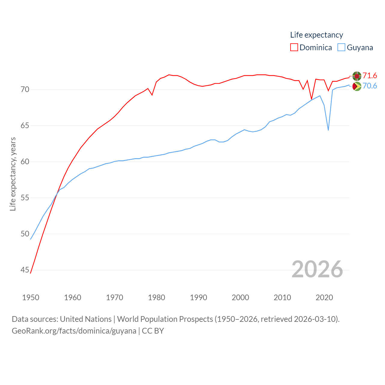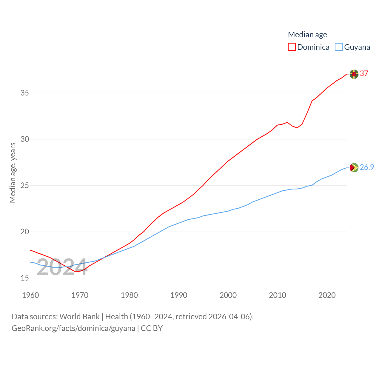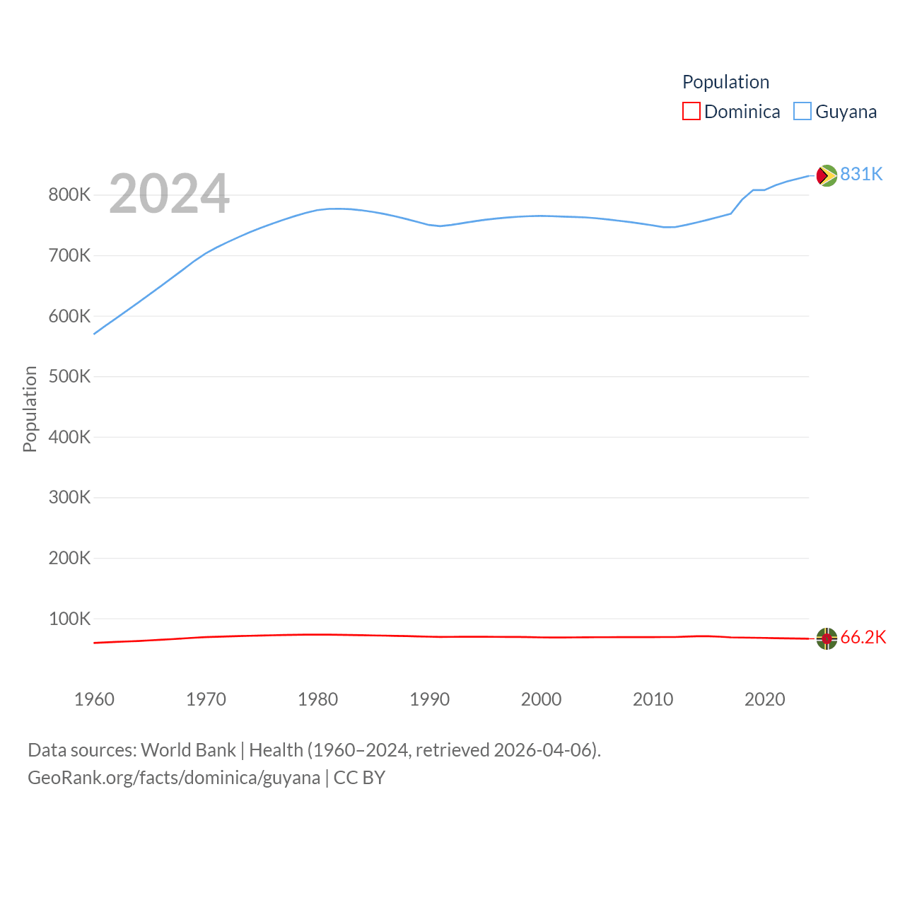 Dominica has a population of 66.2K (ranked 188/197), compared with 831K in Guyana (ranked 161/197). Dominica's land area is 289.6 sq mi versus 81,522 sq mi for Guyana (ranked 175th vs. 82nd).