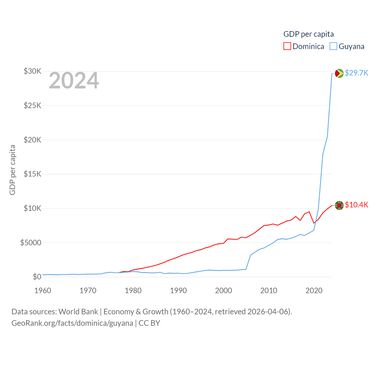 By GDP, Dominica ranks 190/197 ($689M) and Guyana ranks 120/197 ($24.7B). By GDP per capita, Dominica ranks 84/197 ($10,405), while Guyana ranks 41/197 ($29,675).