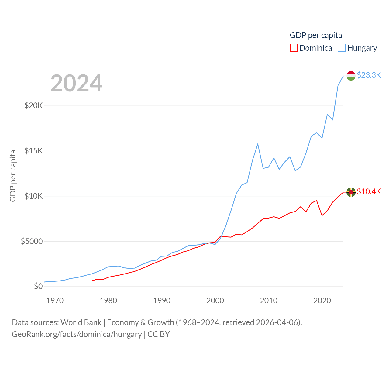 By GDP, Dominica ranks 190/197 ($689M) and Hungary ranks 55/197 ($223B). By GDP per capita, Dominica ranks 84/197 ($10,405), while Hungary ranks 55/197 ($23,292).