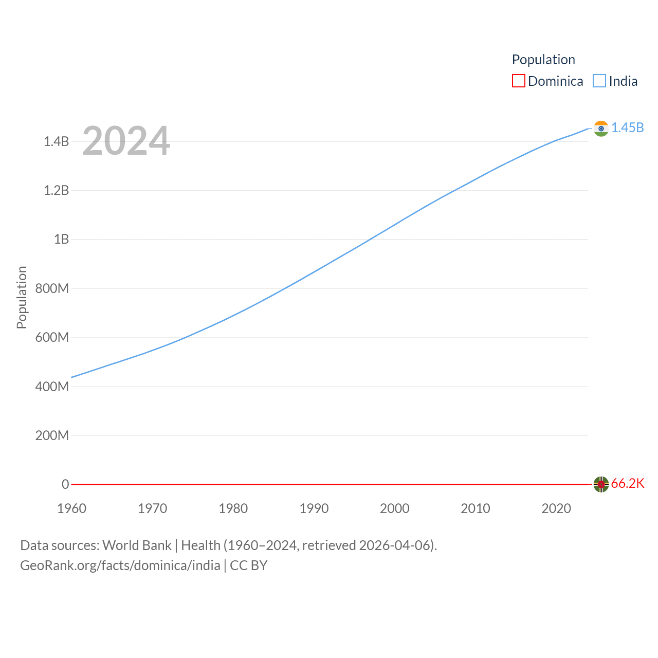 Dominica has a population of 66.2K (ranked 188/197), compared with 1.45B in India (ranked 1/197). Dominica's land area is 289.6 sq mi versus 1,147,955 sq mi for India (ranked 175th vs. 7th).