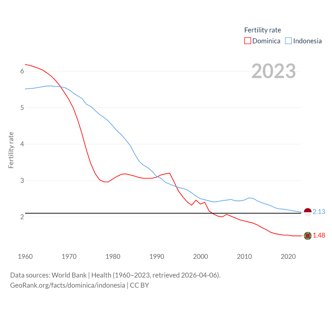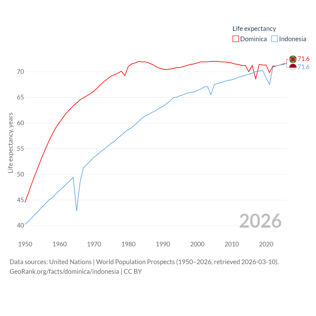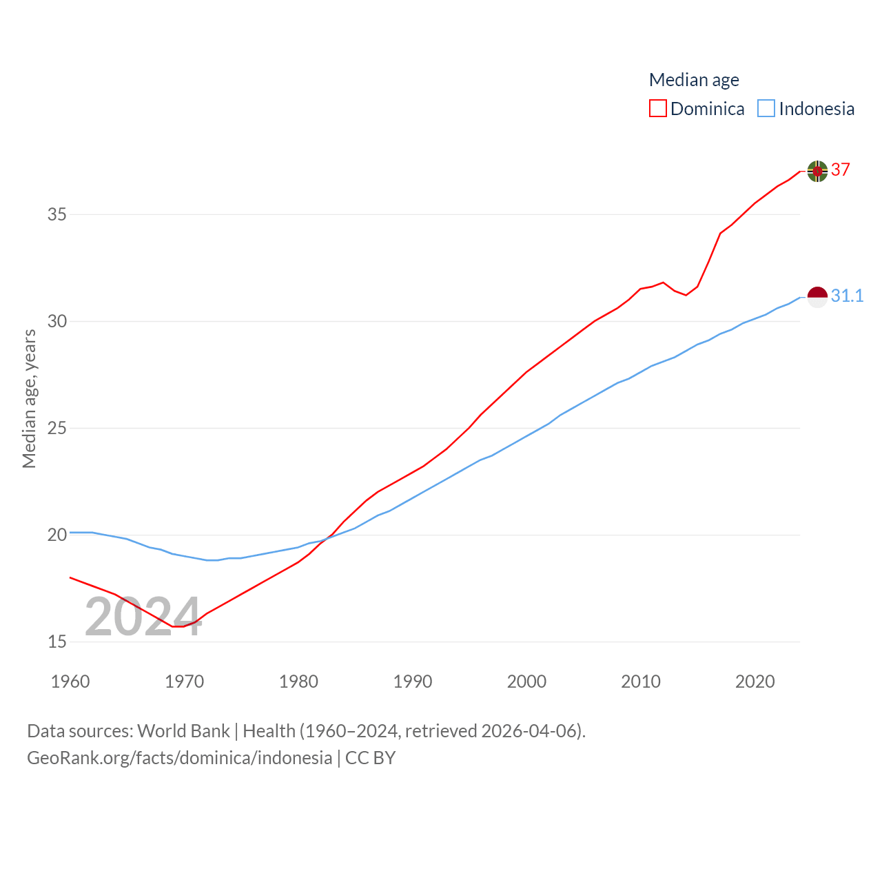 Dominica has a population of 66.2K (ranked 188/197), compared with 283M in Indonesia (ranked 4/197). Dominica's land area is 289.6 sq mi versus 730,720 sq mi for Indonesia (ranked 175th vs. 14th).