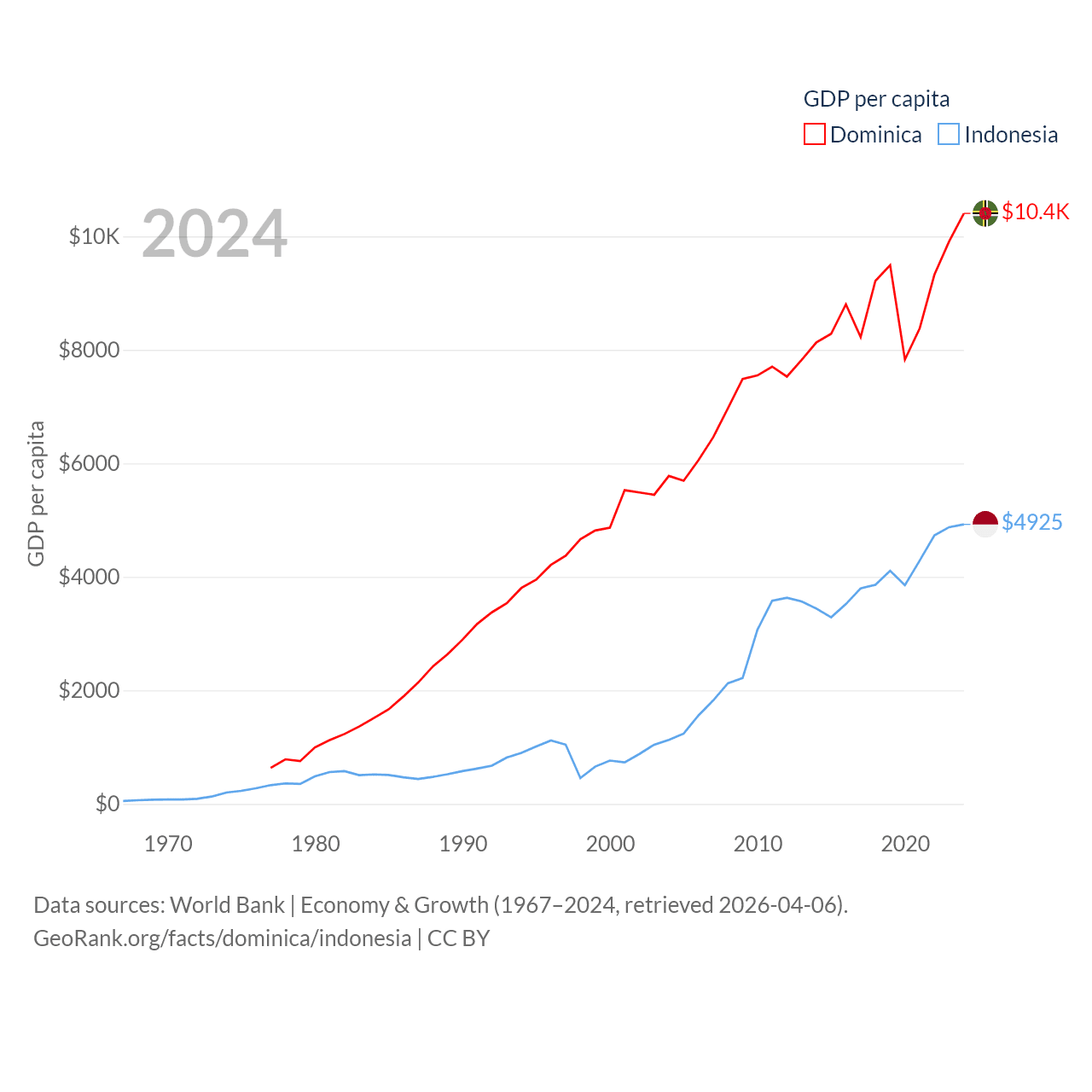By GDP, Dominica ranks 190/197 ($689M) and Indonesia ranks 16/197 ($1.4T). By GDP per capita, Dominica ranks 84/197 ($10,405), while Indonesia ranks 121/197 ($4,925).