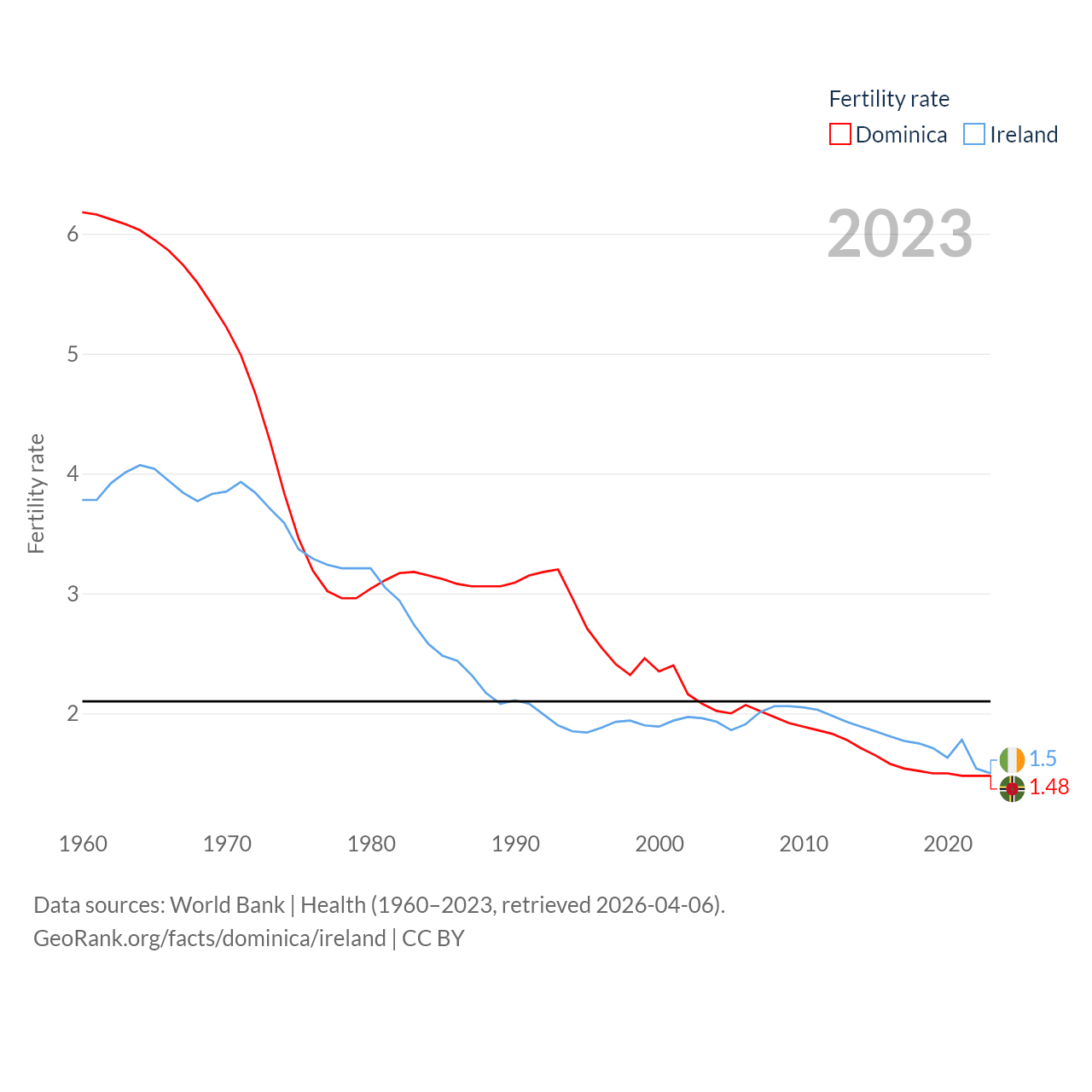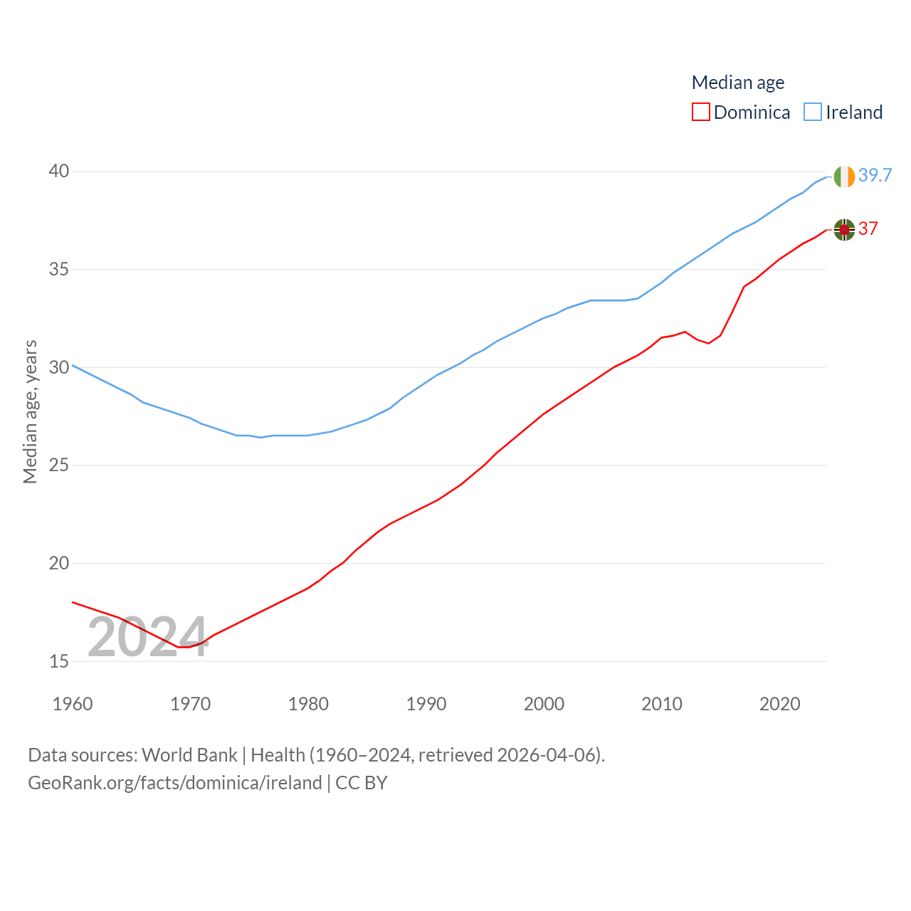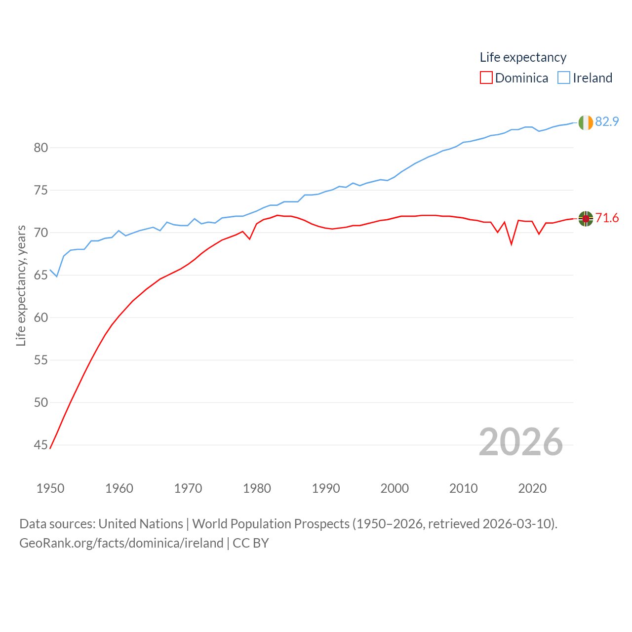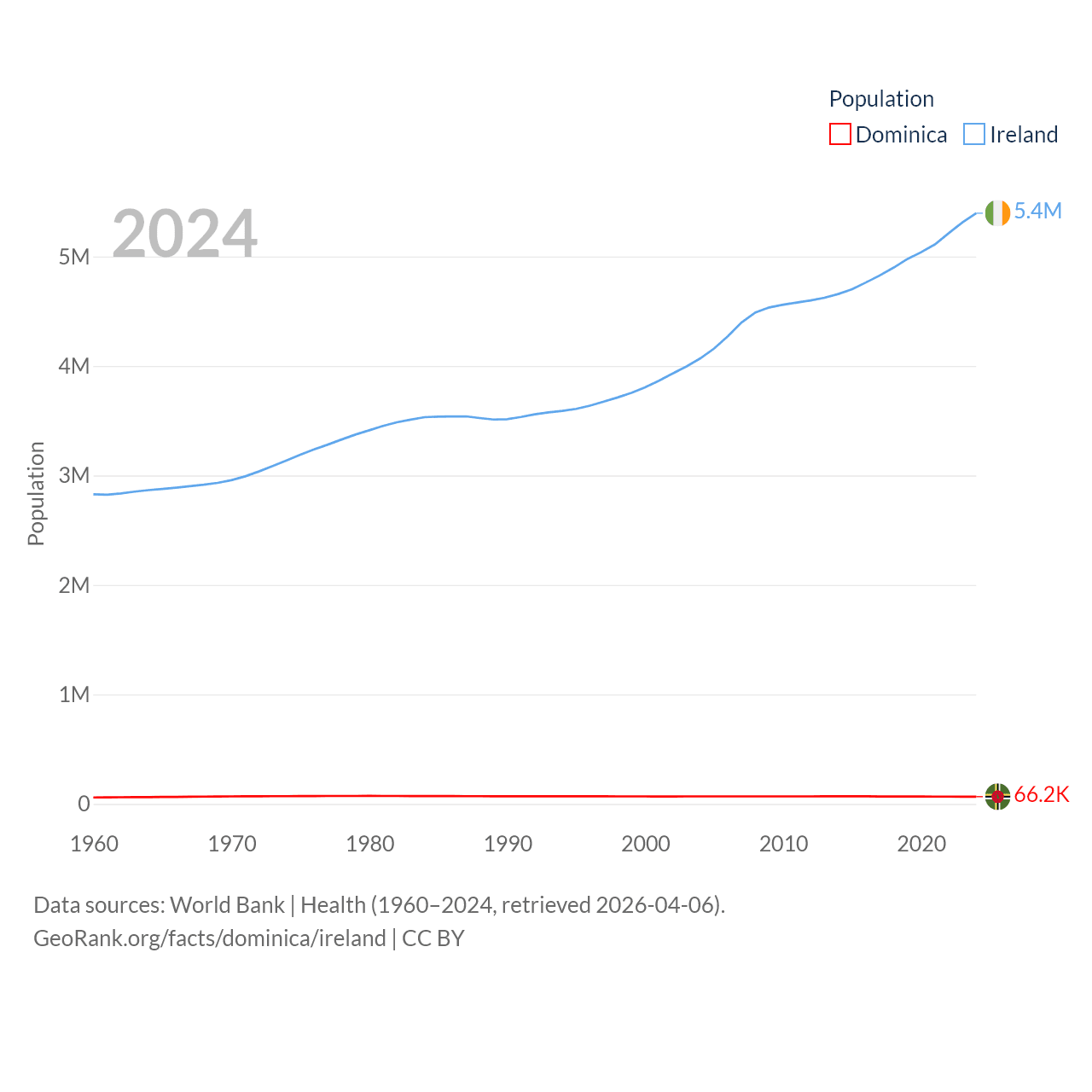 Dominica has a population of 66.2K (ranked 188/197), compared with 5.4M in Ireland (ranked 120/197). Dominica's land area is 289.6 sq mi versus 26,599 sq mi for Ireland (ranked 175th vs. 119th).