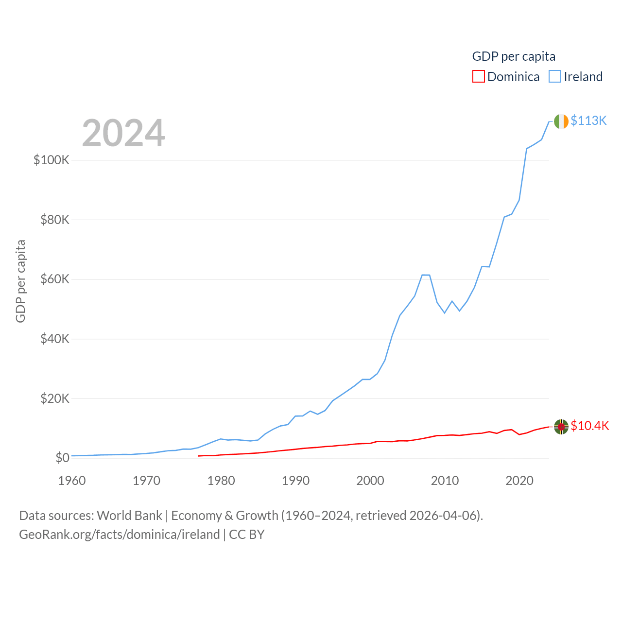 By GDP, Dominica ranks 190/197 ($689M) and Ireland ranks 25/197 ($609B). By GDP per capita, Dominica ranks 84/197 ($10,405), while Ireland ranks 4/197 ($112,895).