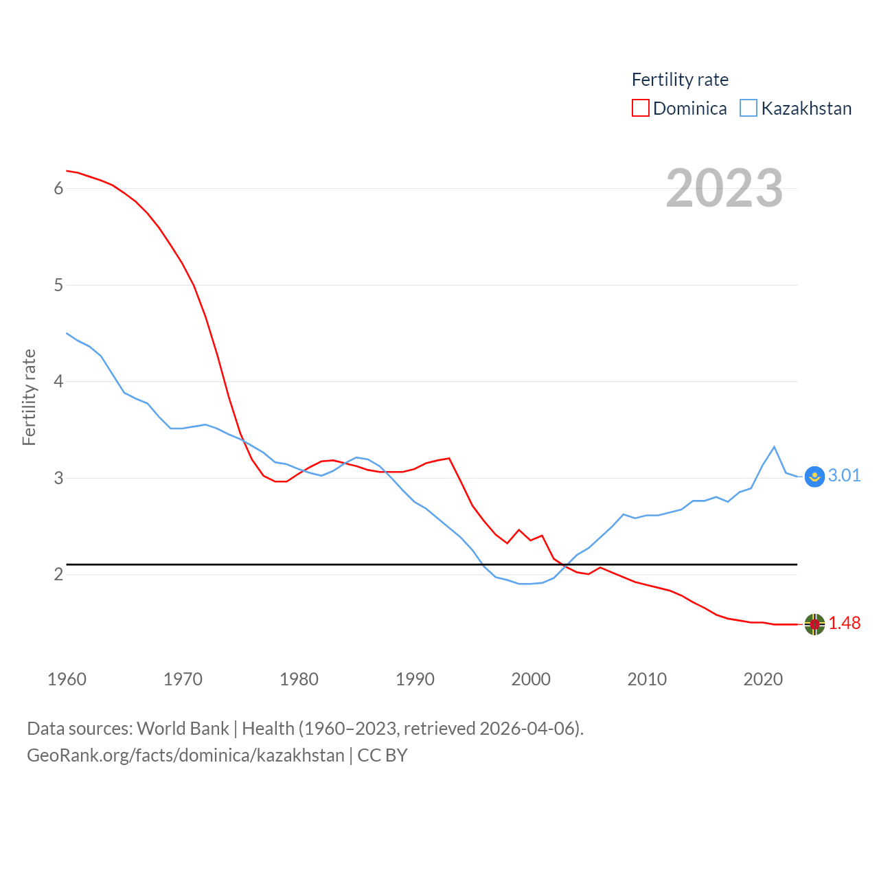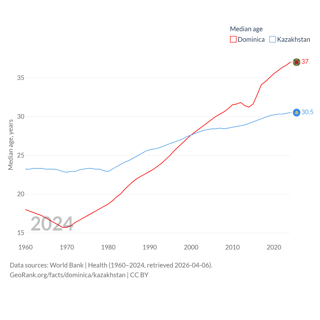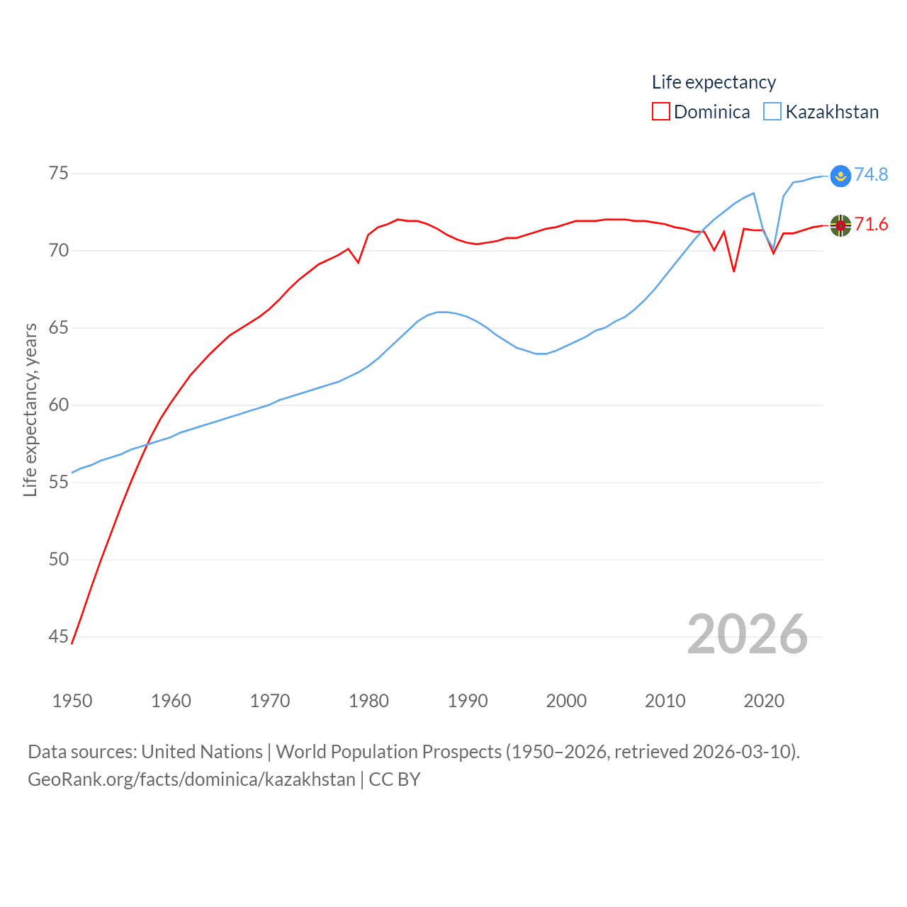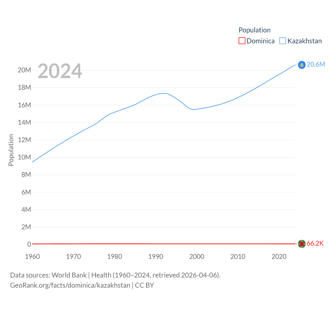 Dominica has a population of 66.2K (ranked 188/197), compared with 20.6M in Kazakhstan (ranked 64/197). Dominica's land area is 289.6 sq mi versus 1,042,360 sq mi for Kazakhstan (ranked 175th vs. 9th).