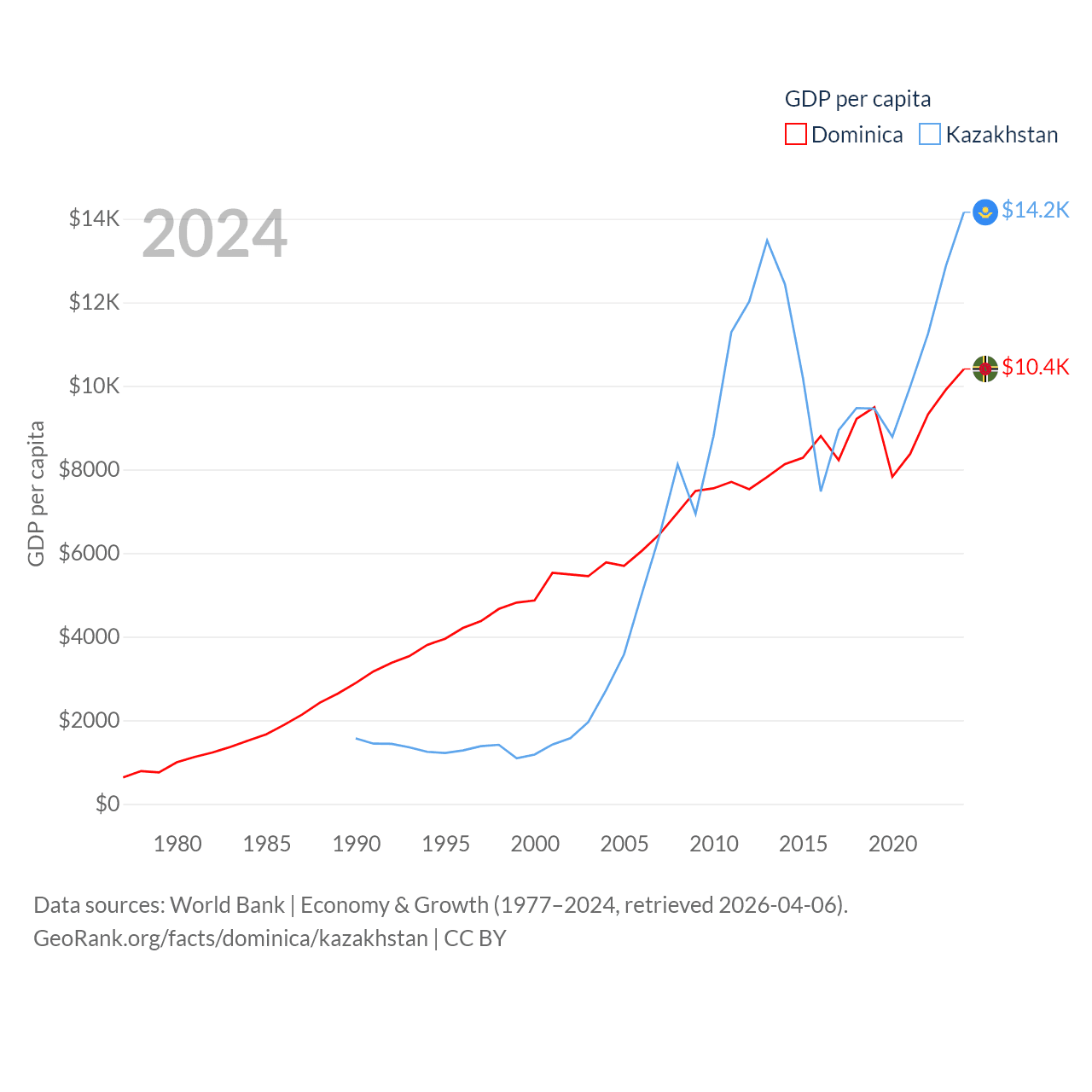 By GDP, Dominica ranks 190/197 ($689M) and Kazakhstan ranks 48/197 ($291B). By GDP per capita, Dominica ranks 84/197 ($10,405), while Kazakhstan ranks 71/197 ($14,155).