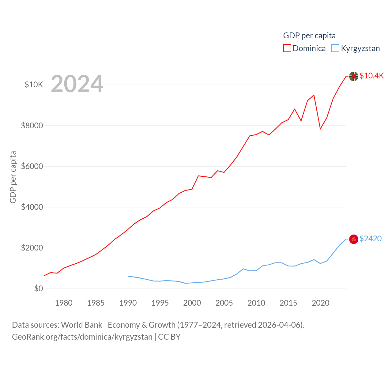 By GDP, Dominica ranks 190/197 ($689M) and Kyrgyzstan ranks 135/197 ($17.5B). By GDP per capita, Dominica ranks 84/197 ($10,405), while Kyrgyzstan ranks 150/197 ($2,420).