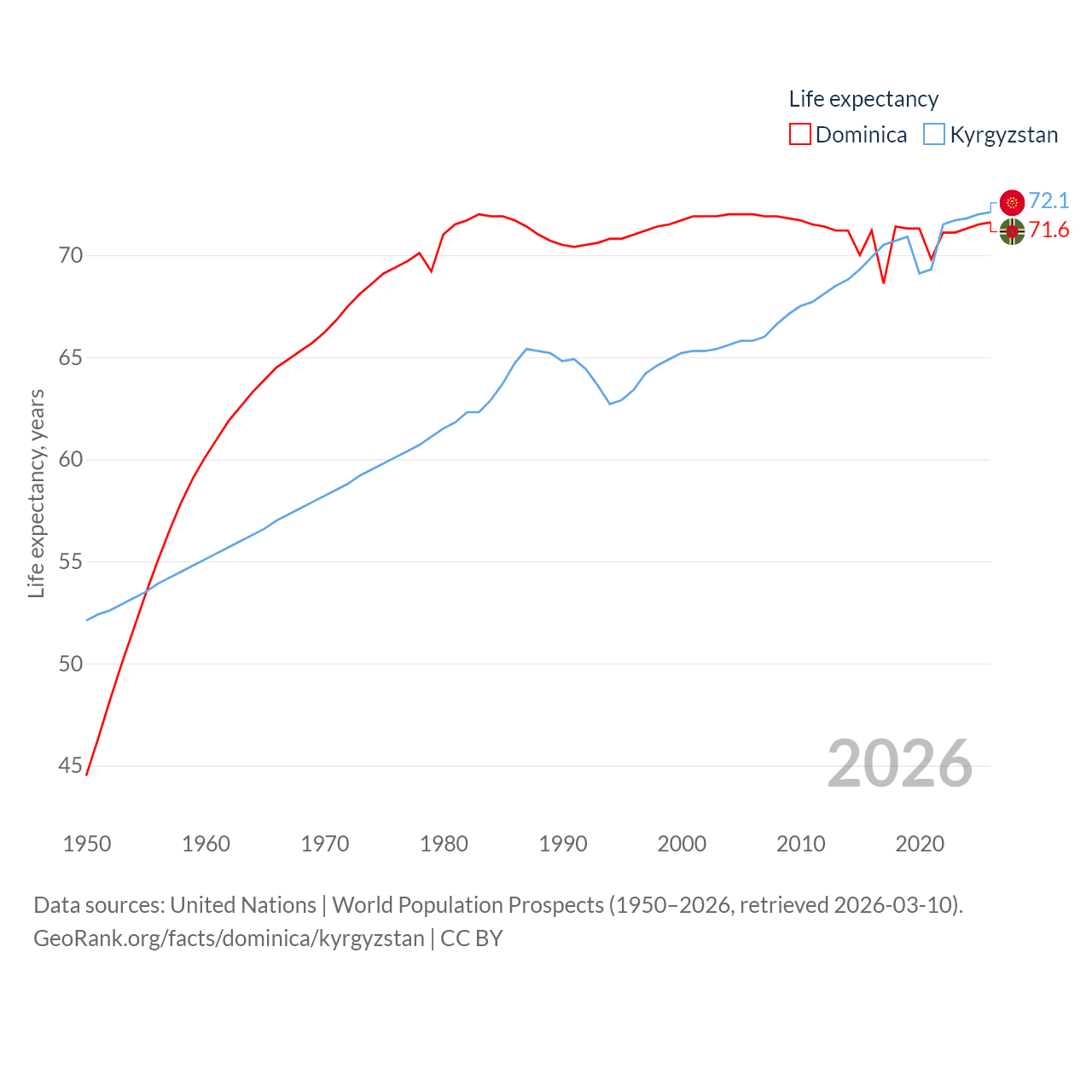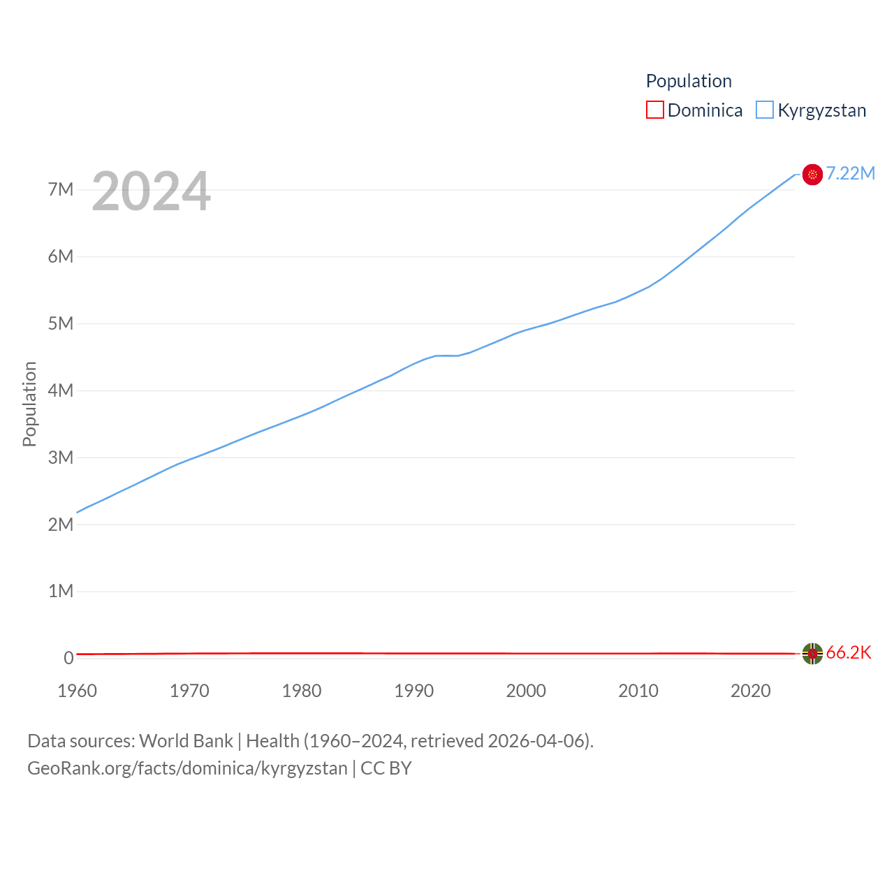 Dominica has a population of 66.2K (ranked 188/197), compared with 7.22M in Kyrgyzstan (ranked 106/197). Dominica's land area is 289.6 sq mi versus 74,054 sq mi for Kyrgyzstan (ranked 175th vs. 86th).