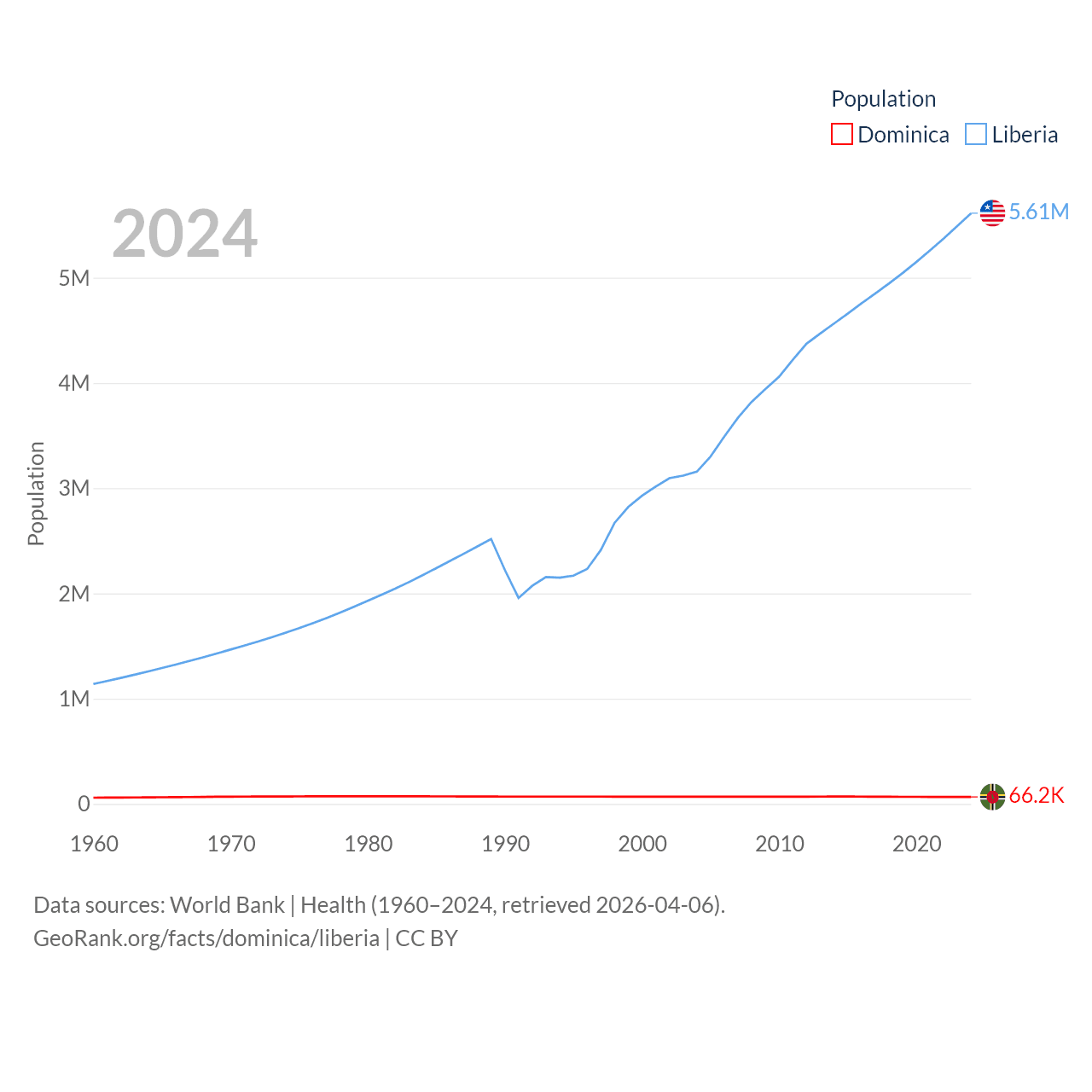 Dominica has a population of 66.2K (ranked 188/197), compared with 5.61M in Liberia (ranked 117/197). Dominica's land area is 289.6 sq mi versus 37,189 sq mi for Liberia (ranked 175th vs. 106th).