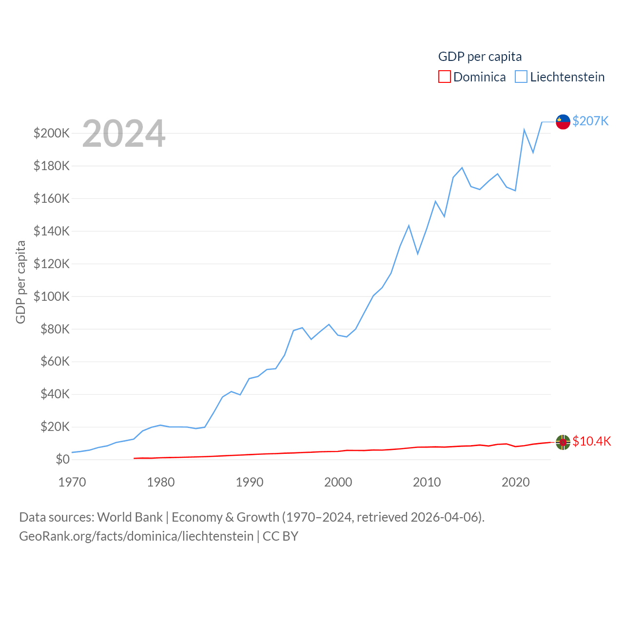 By GDP, Dominica ranks 190/197 ($689M) and Liechtenstein ranks 156/197 ($8.24B). By GDP per capita, Dominica ranks 84/197 ($10,405), while Liechtenstein ranks 2/197 ($206,781).