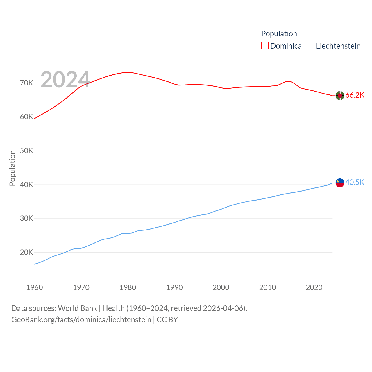 Dominica has a population of 66.2K (ranked 188/197), compared with 40.4K in Liechtenstein (ranked 190/197). Dominica's land area is 289.6 sq mi versus 61.8 sq mi for Liechtenstein (ranked 175th vs. 192nd).