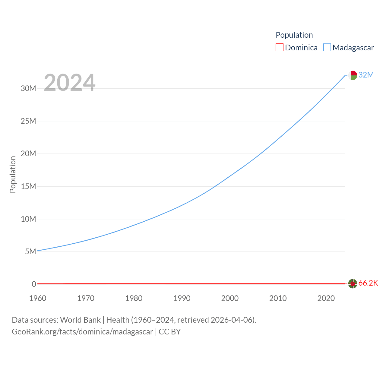 Dominica has a population of 66.2K (ranked 188/197), compared with 32M in Madagascar (ranked 49/197). Dominica's land area is 289.6 sq mi versus 224,634 sq mi for Madagascar (ranked 175th vs. 44th).