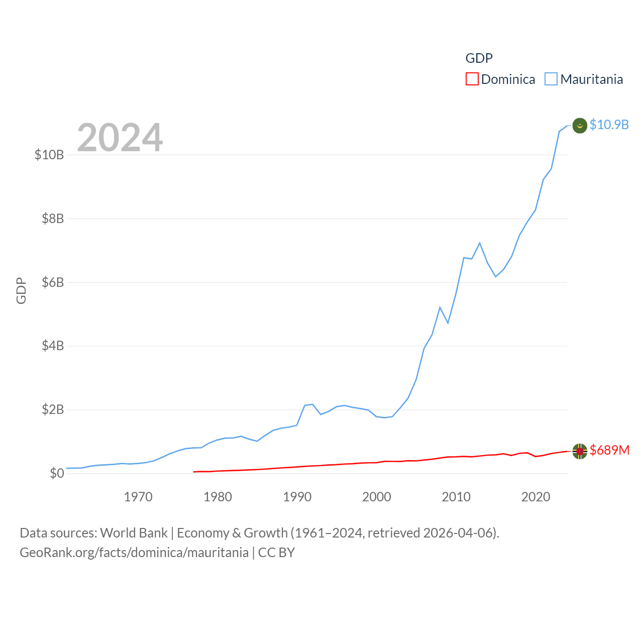 By GDP, Dominica ranks 190/197 ($689M) and Mauritania ranks 153/197 ($10.9B). By GDP per capita, Dominica ranks 84/197 ($10,405), while Mauritania ranks 156/197 ($2,110).