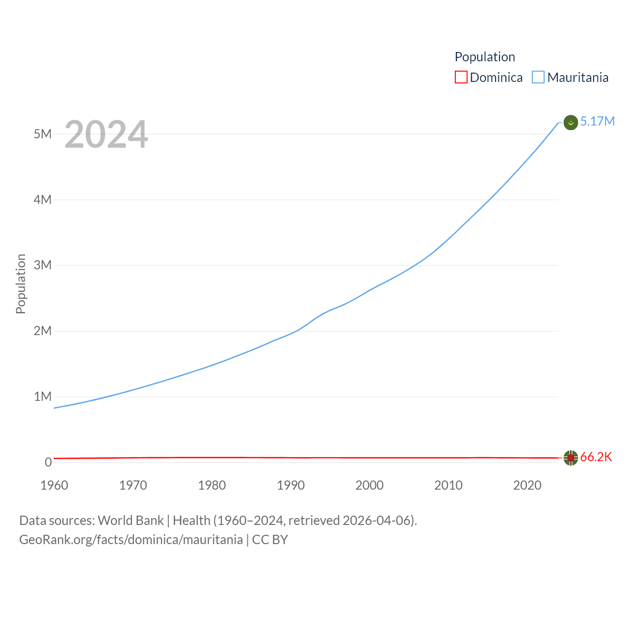 Dominica has a population of 66.2K (ranked 188/197), compared with 5.17M in Mauritania (ranked 125/197). Dominica's land area is 289.6 sq mi versus 397,955 sq mi for Mauritania (ranked 175th vs. 28th).