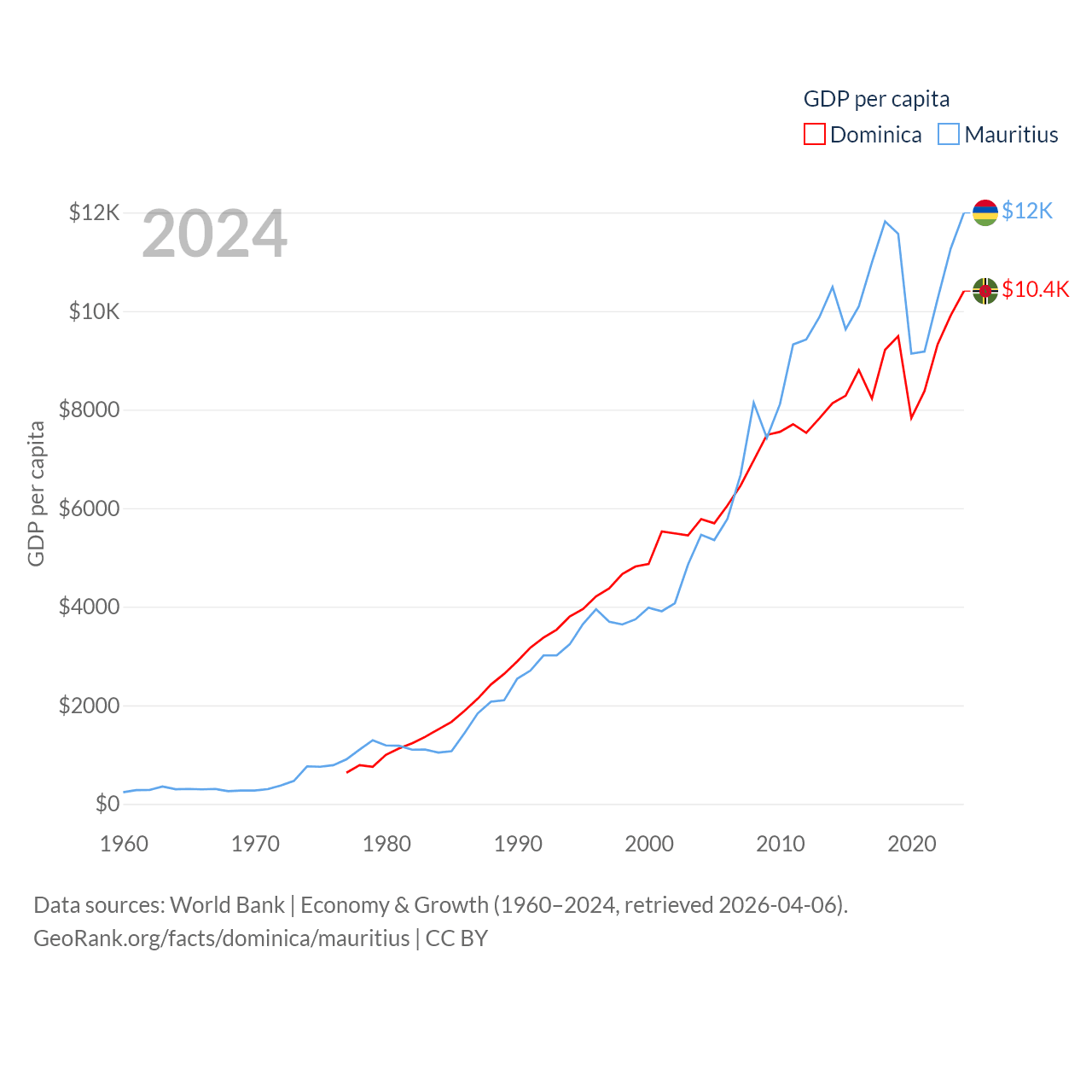 By GDP, Dominica ranks 190/197 ($689M) and Mauritius ranks 143/197 ($14.9B). By GDP per capita, Dominica ranks 84/197 ($10,405), while Mauritius ranks 78/197 ($11,991).