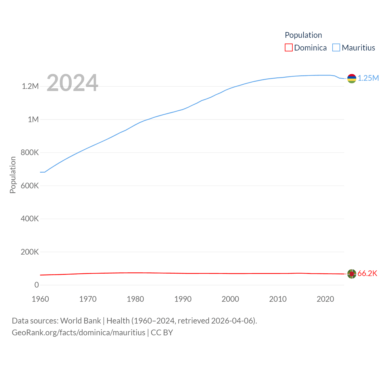 Dominica has a population of 66.2K (ranked 188/197), compared with 1.25M in Mauritius (ranked 156/197). Dominica's land area is 289.6 sq mi versus 771 sq mi for Mauritius (ranked 175th vs. 170th).