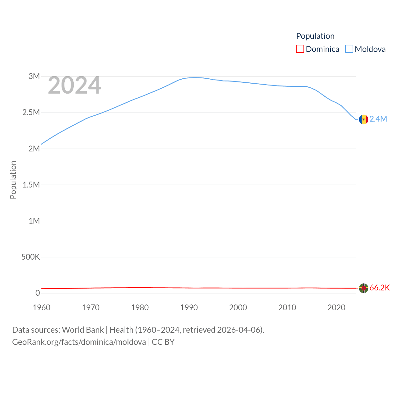 Dominica has a population of 66.2K (ranked 188/197), compared with 2.4M in Moldova (ranked 143/197). Dominica's land area is 289.6 sq mi versus 12,714 sq mi for Moldova (ranked 175th vs. 135th).