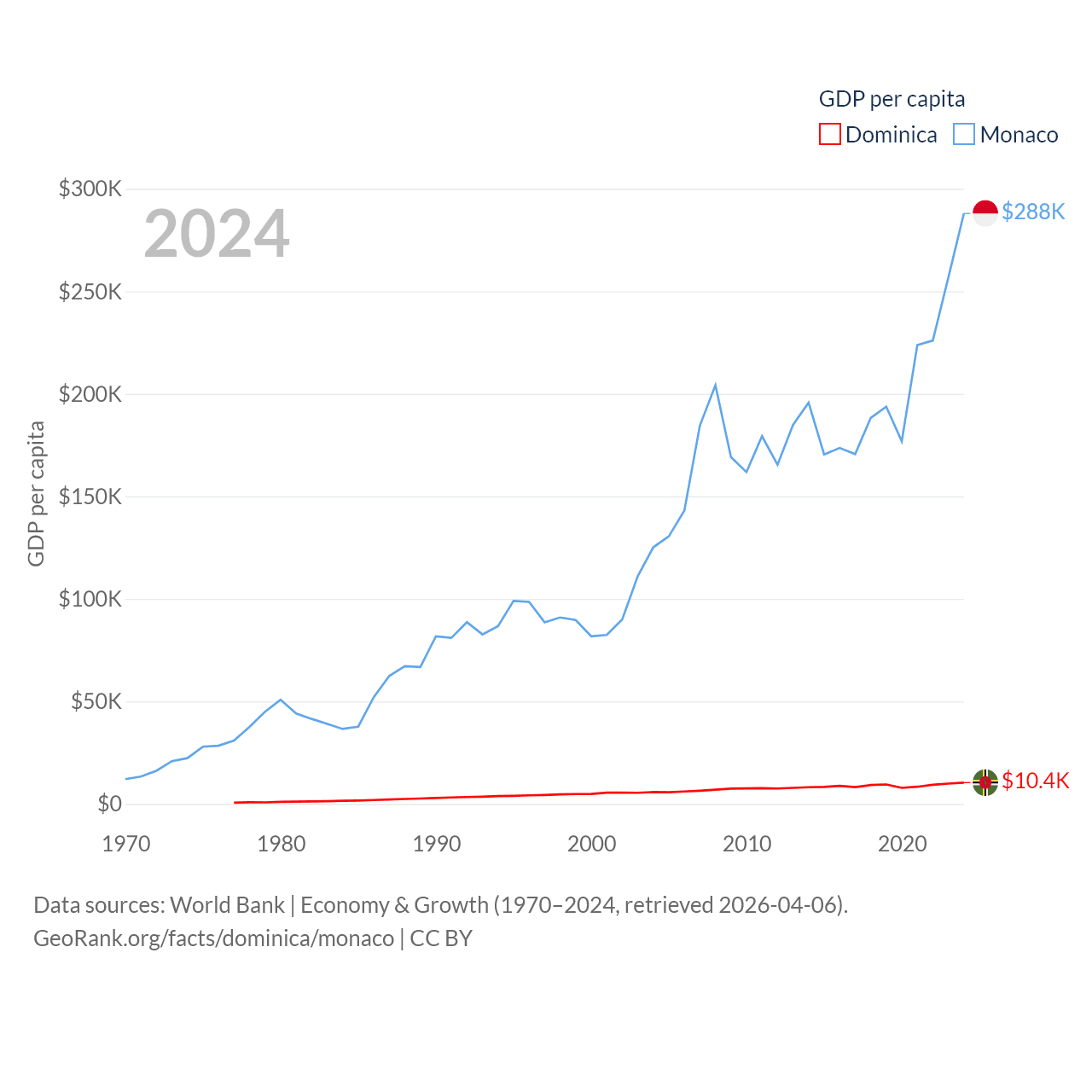 By GDP, Dominica ranks 190/197 ($689M) and Monaco ranks 152/197 ($11.1B). By GDP per capita, Dominica ranks 84/197 ($10,405), while Monaco ranks 1/197 ($288,001).