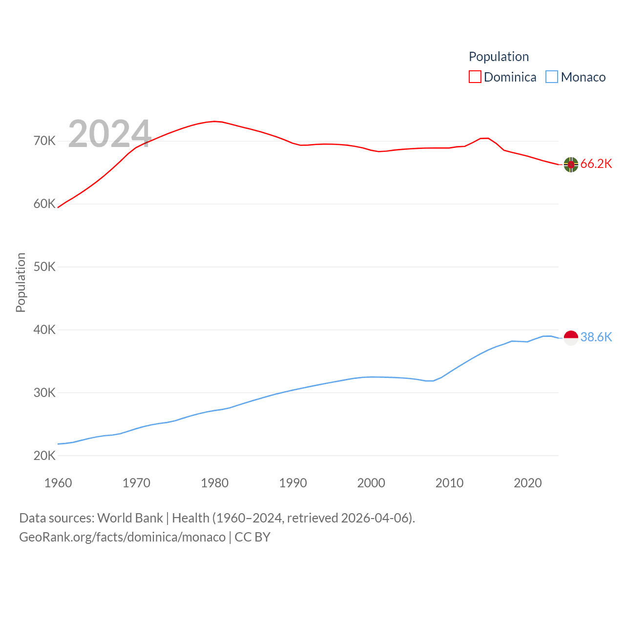Dominica has a population of 66.2K (ranked 188/197), compared with 38.6K in Monaco (ranked 191/197). Dominica's land area is 289.6 sq mi versus 0.8 sq mi for Monaco (ranked 175th vs. 196th).