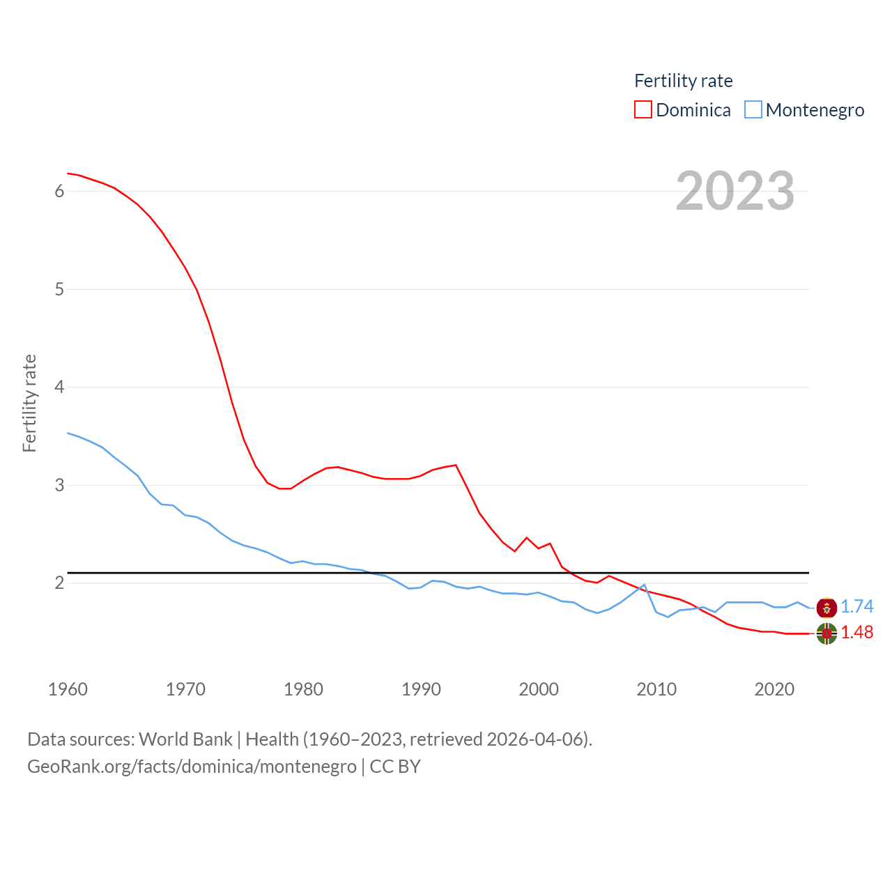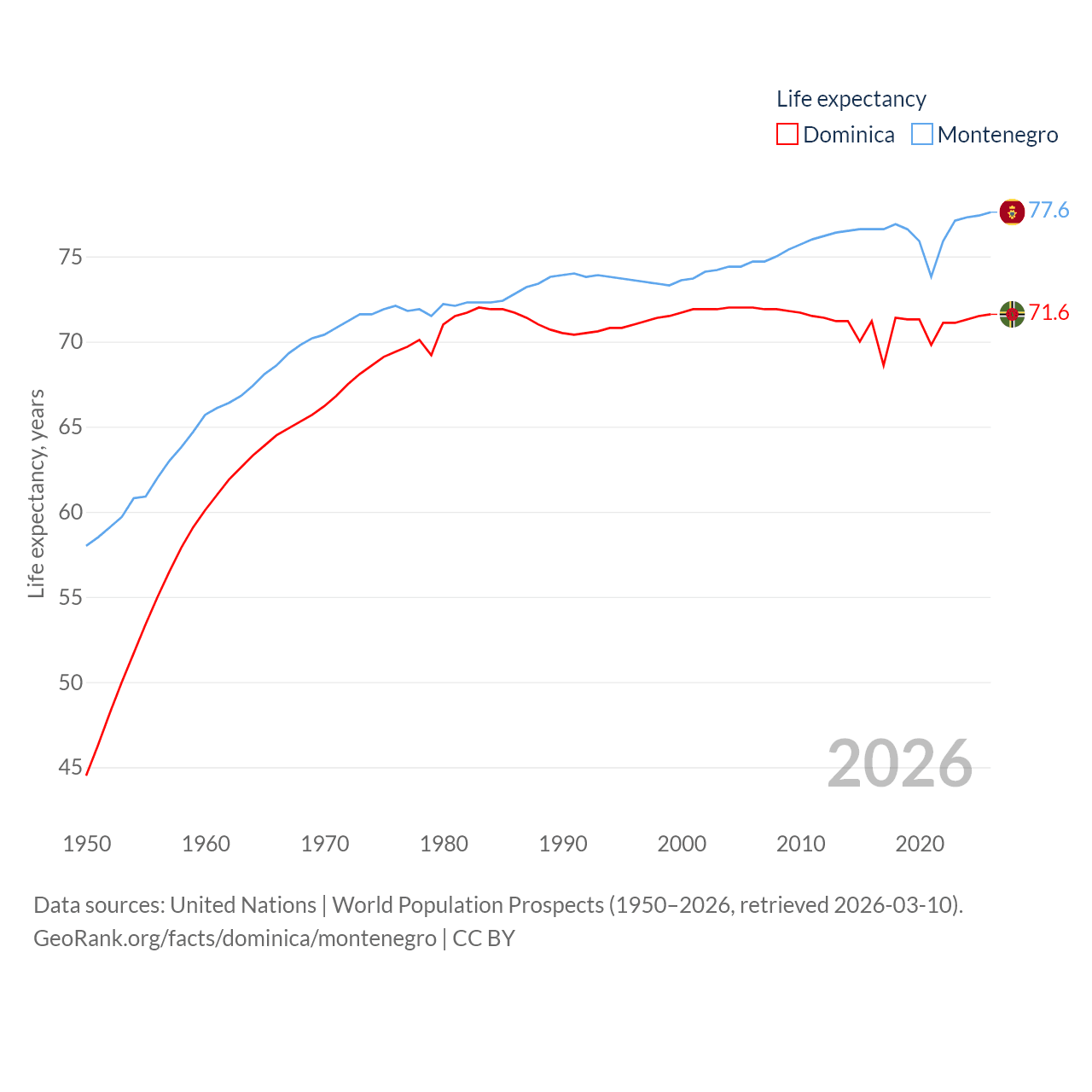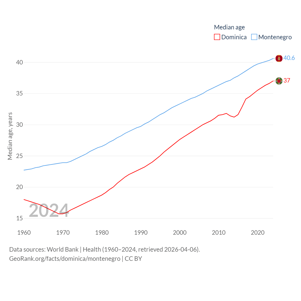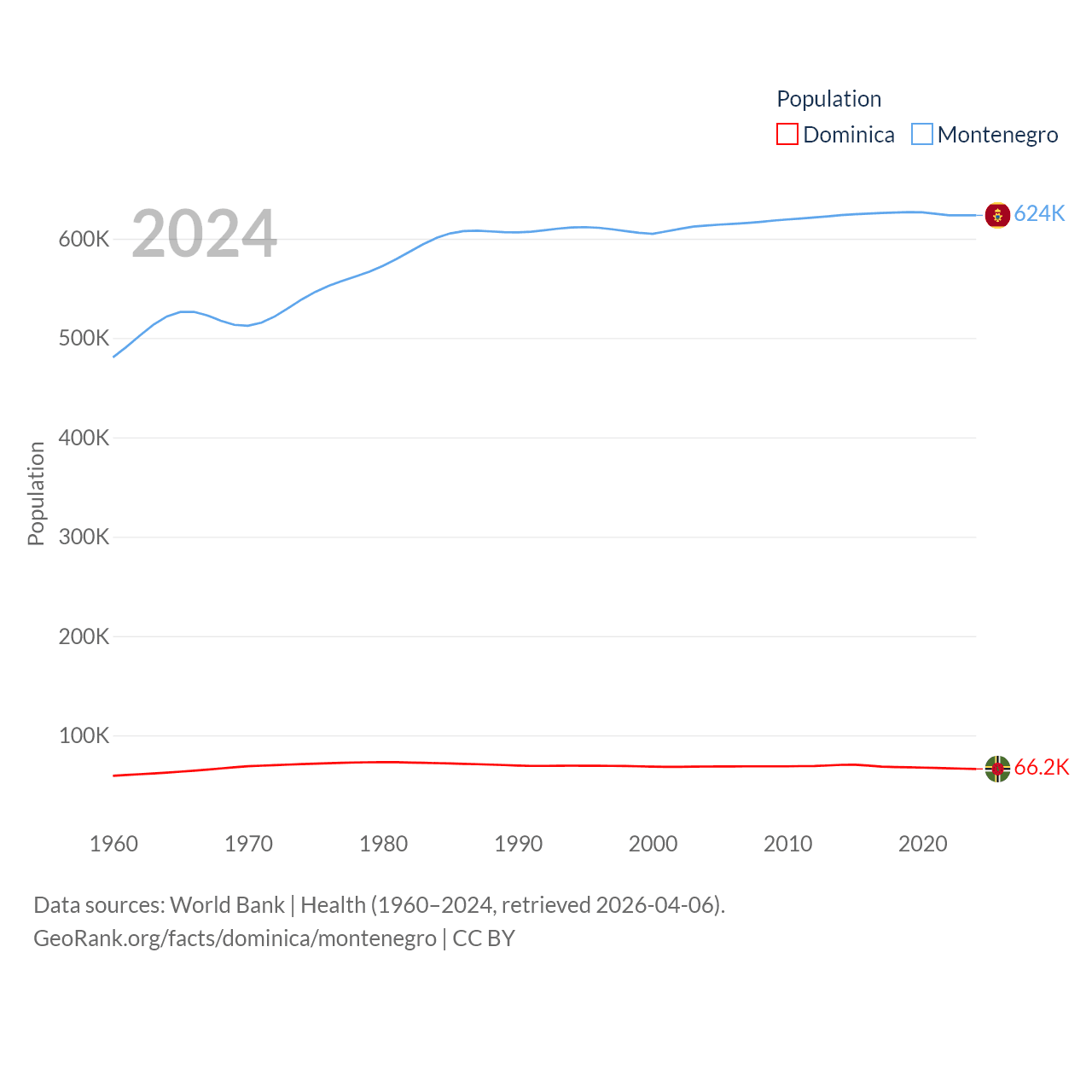 Dominica has a population of 66.2K (ranked 188/197), compared with 624K in Montenegro (ranked 166/197). Dominica's land area is 289.6 sq mi versus 5,193 sq mi for Montenegro (ranked 175th vs. 156th).