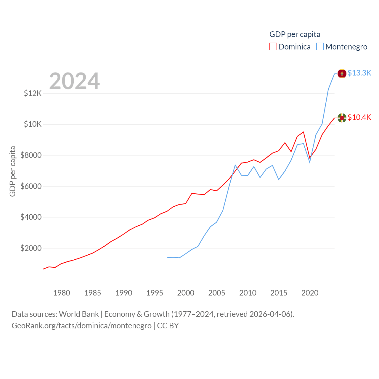 By GDP, Dominica ranks 190/197 ($689M) and Montenegro ranks 155/197 ($8.27B). By GDP per capita, Dominica ranks 84/197 ($10,405), while Montenegro ranks 77/197 ($13,263).