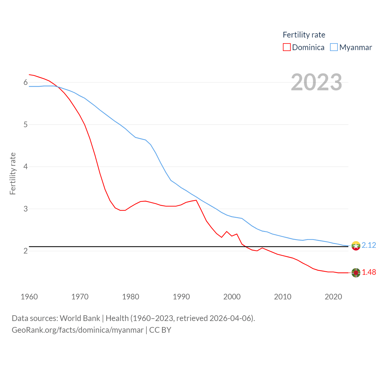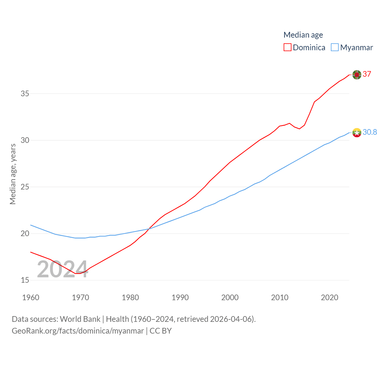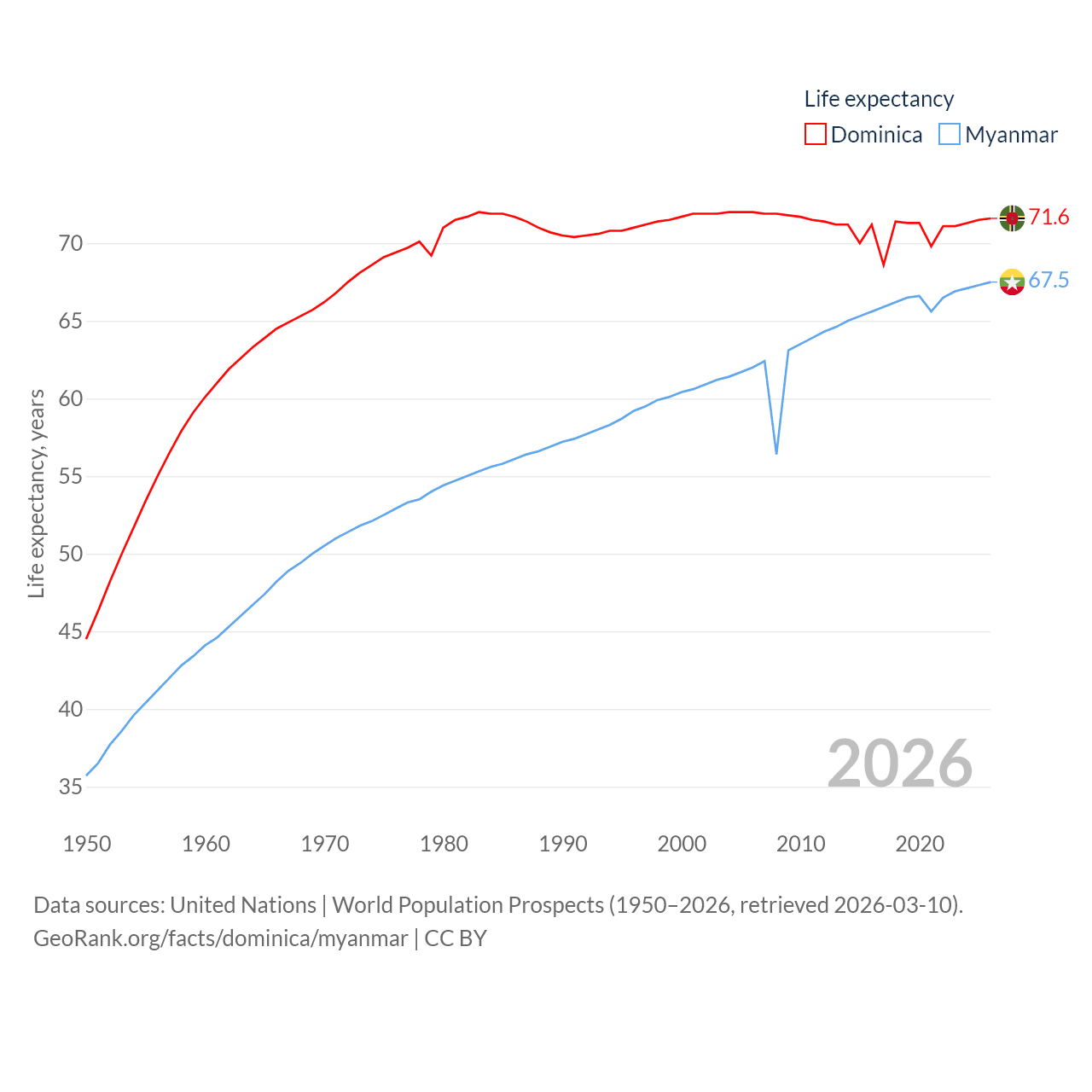 Dominica has a population of 66.2K (ranked 188/197), compared with 54.5M in Myanmar (ranked 27/197). Dominica's land area is 289.6 sq mi versus 251,997 sq mi for Myanmar (ranked 175th vs. 39th).