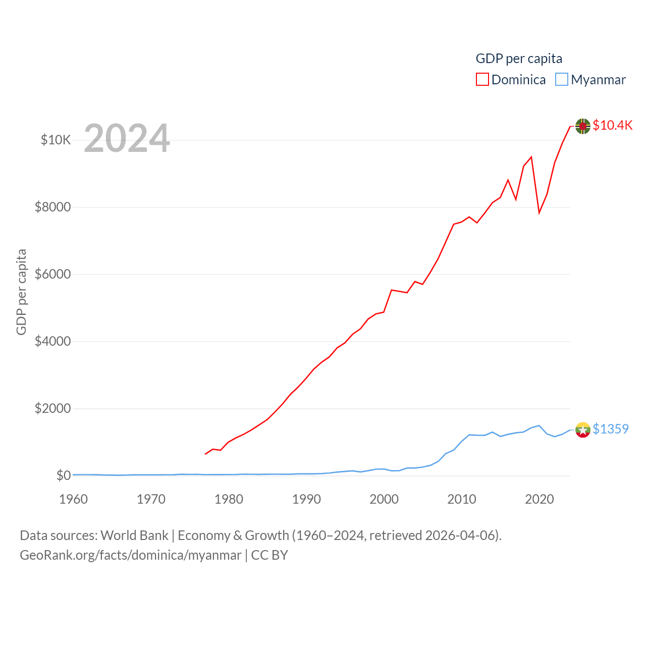 By GDP, Dominica ranks 190/197 ($689M) and Myanmar ranks 85/197 ($74.1B). By GDP per capita, Dominica ranks 84/197 ($10,405), while Myanmar ranks 165/197 ($1,359).
