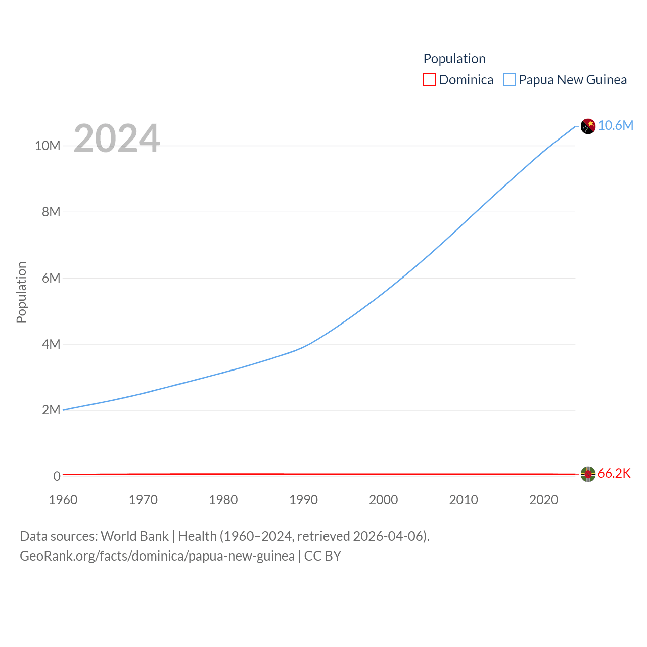 Dominica has a population of 66.2K (ranked 188/197), compared with 10.6M in Papua New Guinea (ranked 92/197). Dominica's land area is 289.6 sq mi versus 174,850 sq mi for Papua New Guinea (ranked 175th vs. 54th).