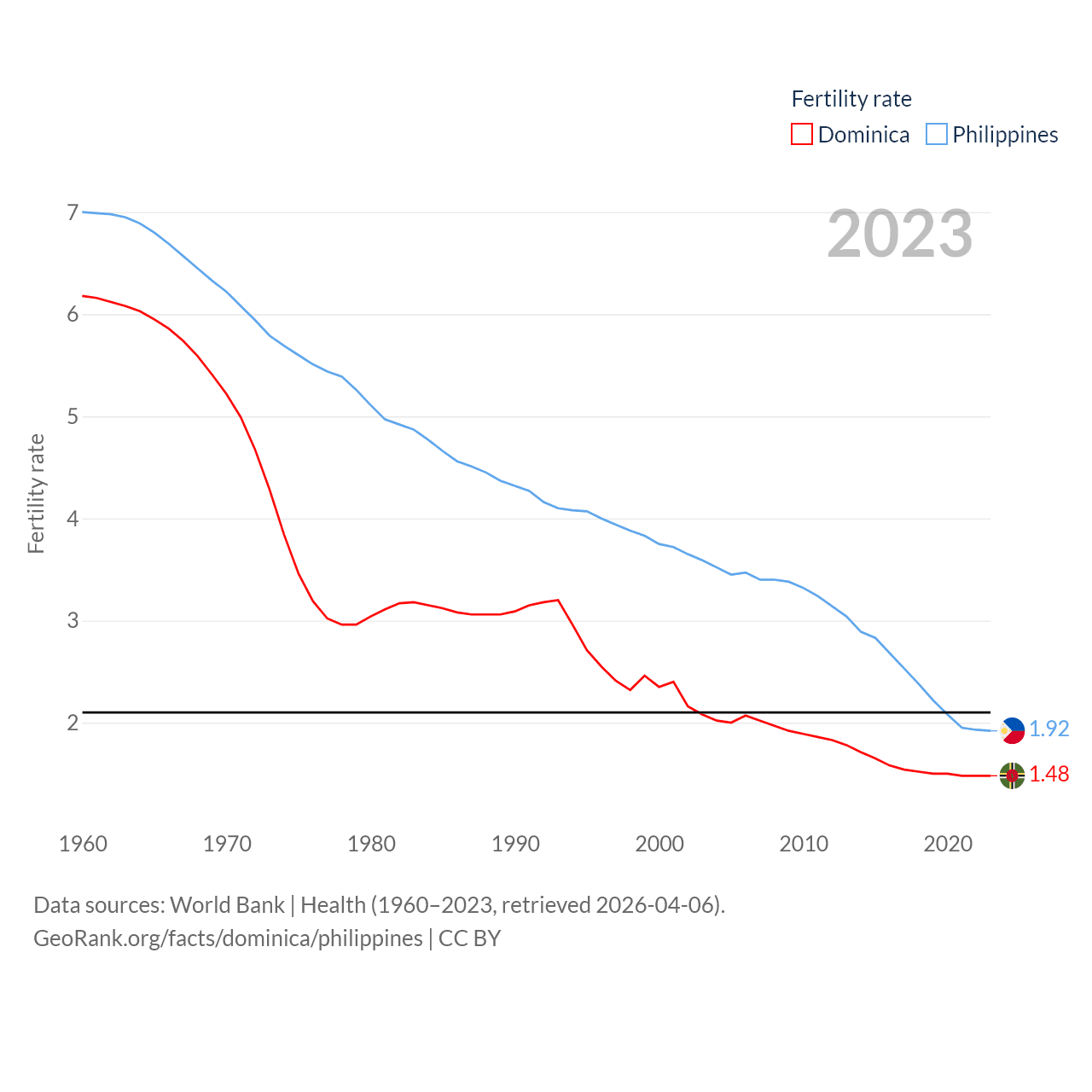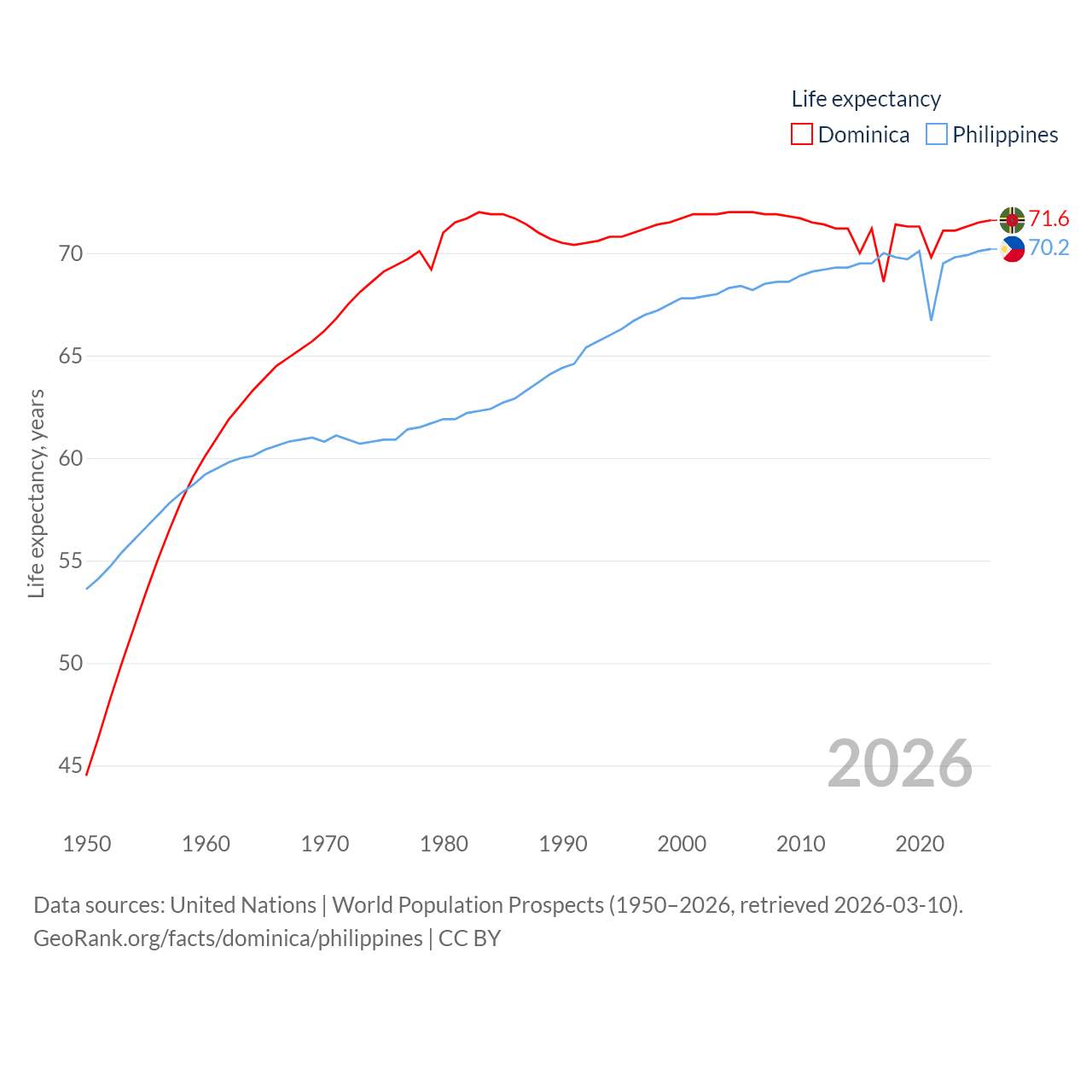 Dominica has a population of 66.2K (ranked 188/197), compared with 116M in The Philippines (ranked 14/197). Dominica's land area is 289.6 sq mi versus 115,124 sq mi for The Philippines (ranked 175th vs. 71st).