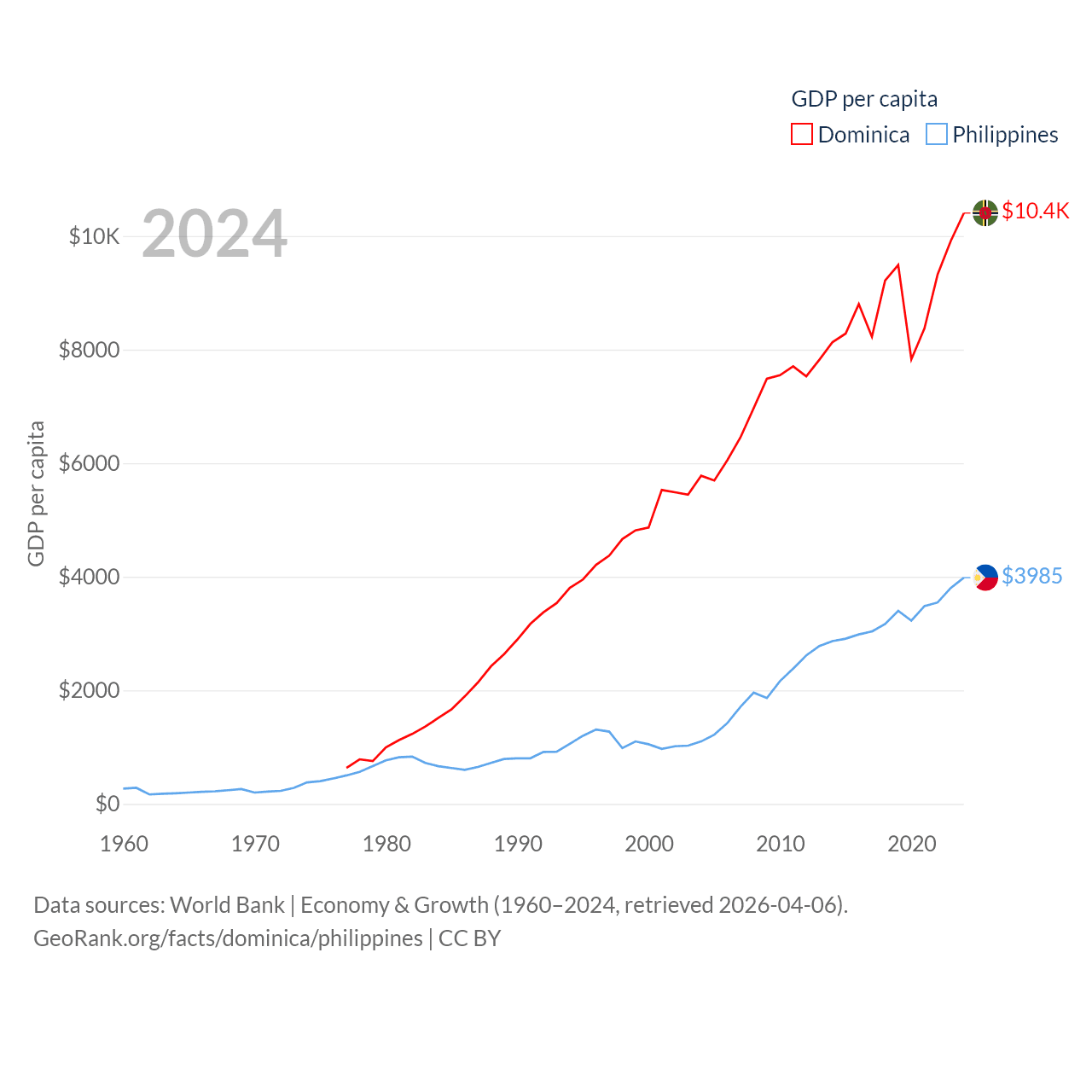 By GDP, Dominica ranks 190/197 ($689M) and The Philippines ranks 35/197 ($462B). By GDP per capita, Dominica ranks 84/197 ($10,405), while The Philippines ranks 130/197 ($3,985).