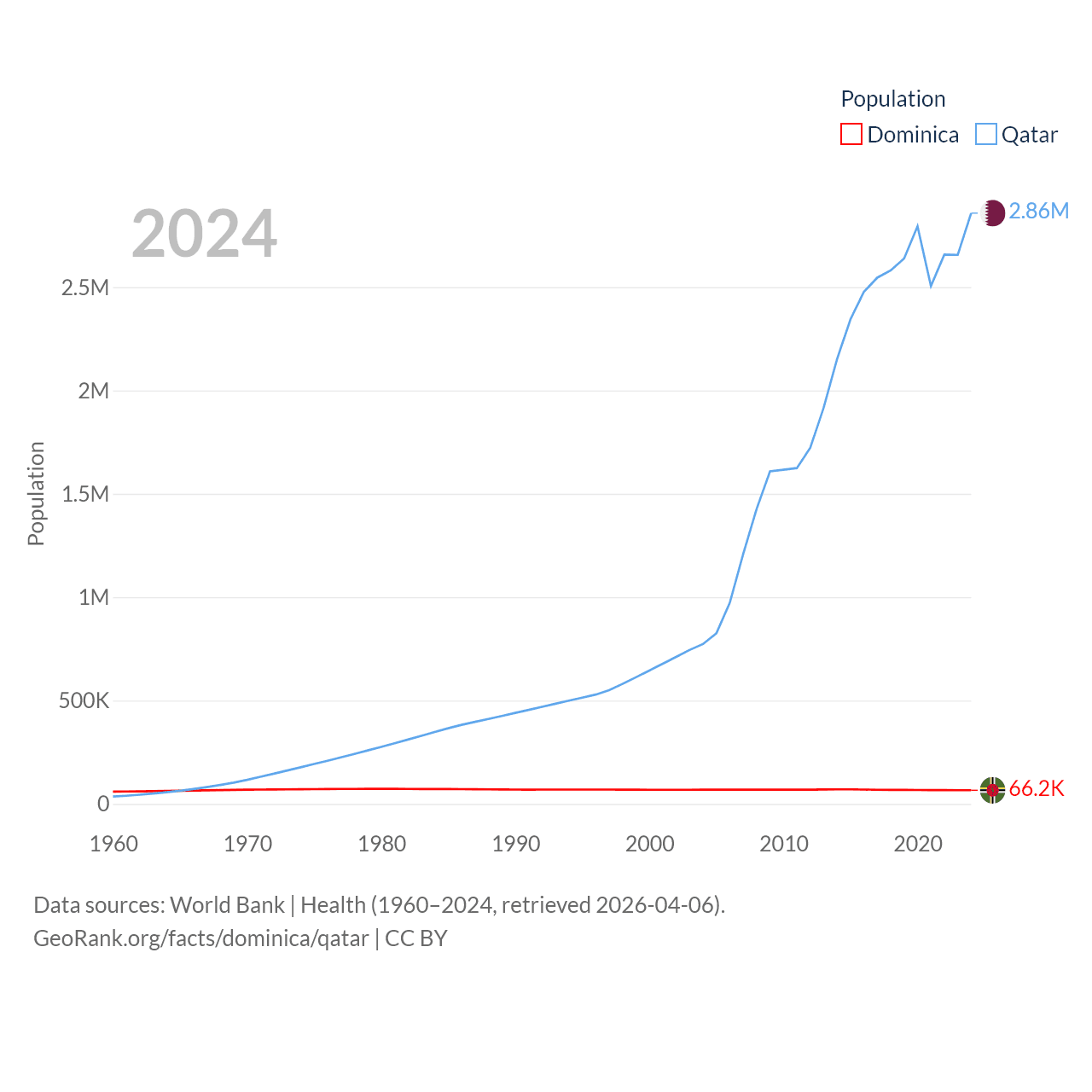 Dominica has a population of 66.2K (ranked 188/197), compared with 2.86M in Qatar (ranked 138/197). Dominica's land area is 289.6 sq mi versus 4,436 sq mi for Qatar (ranked 175th vs. 158th).
