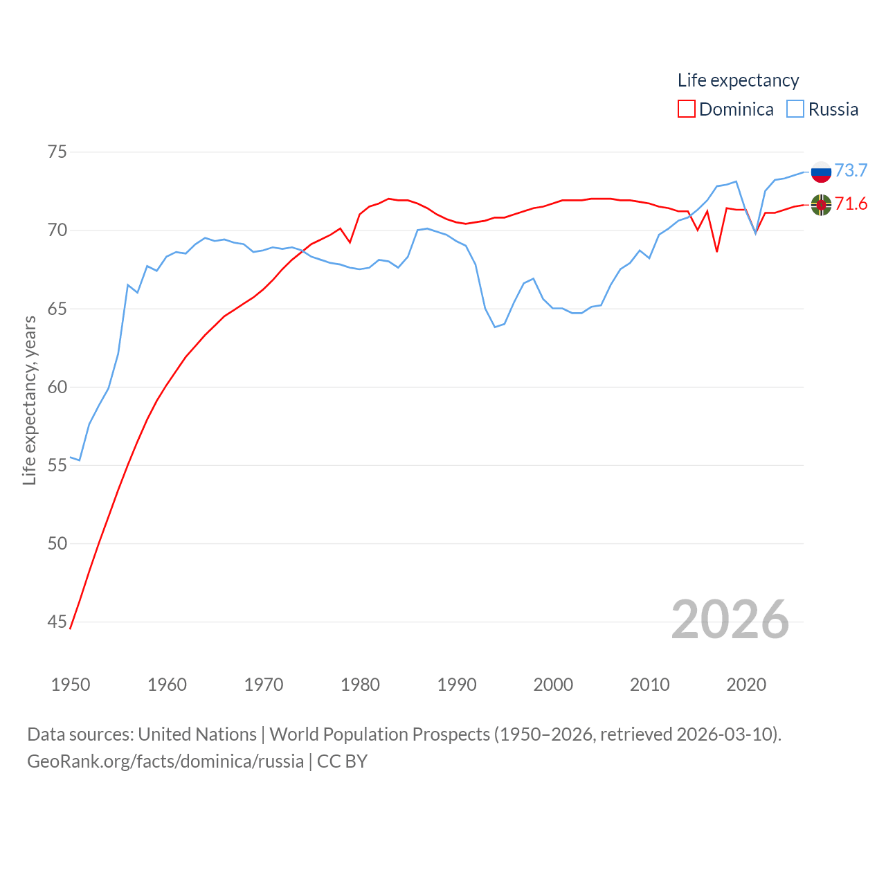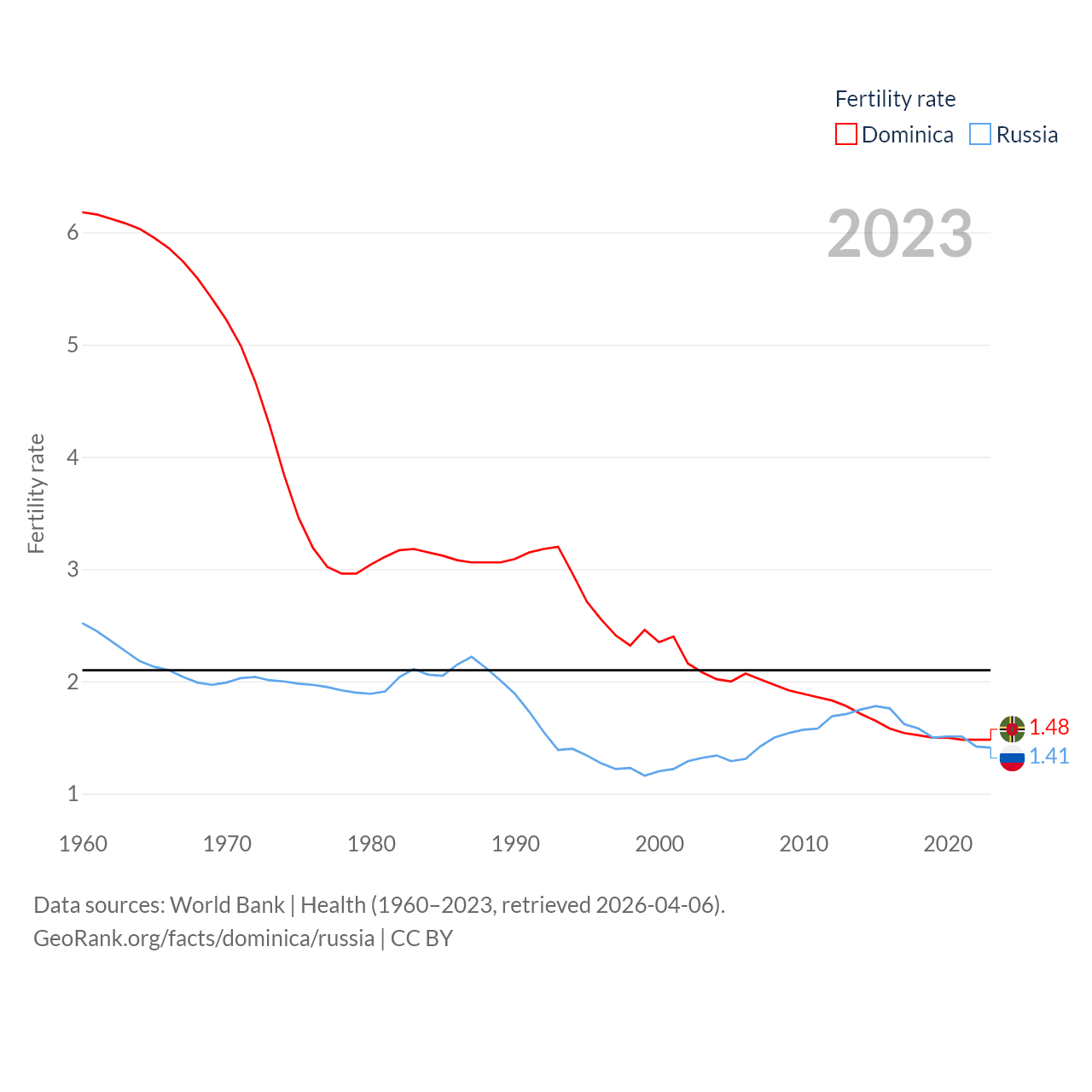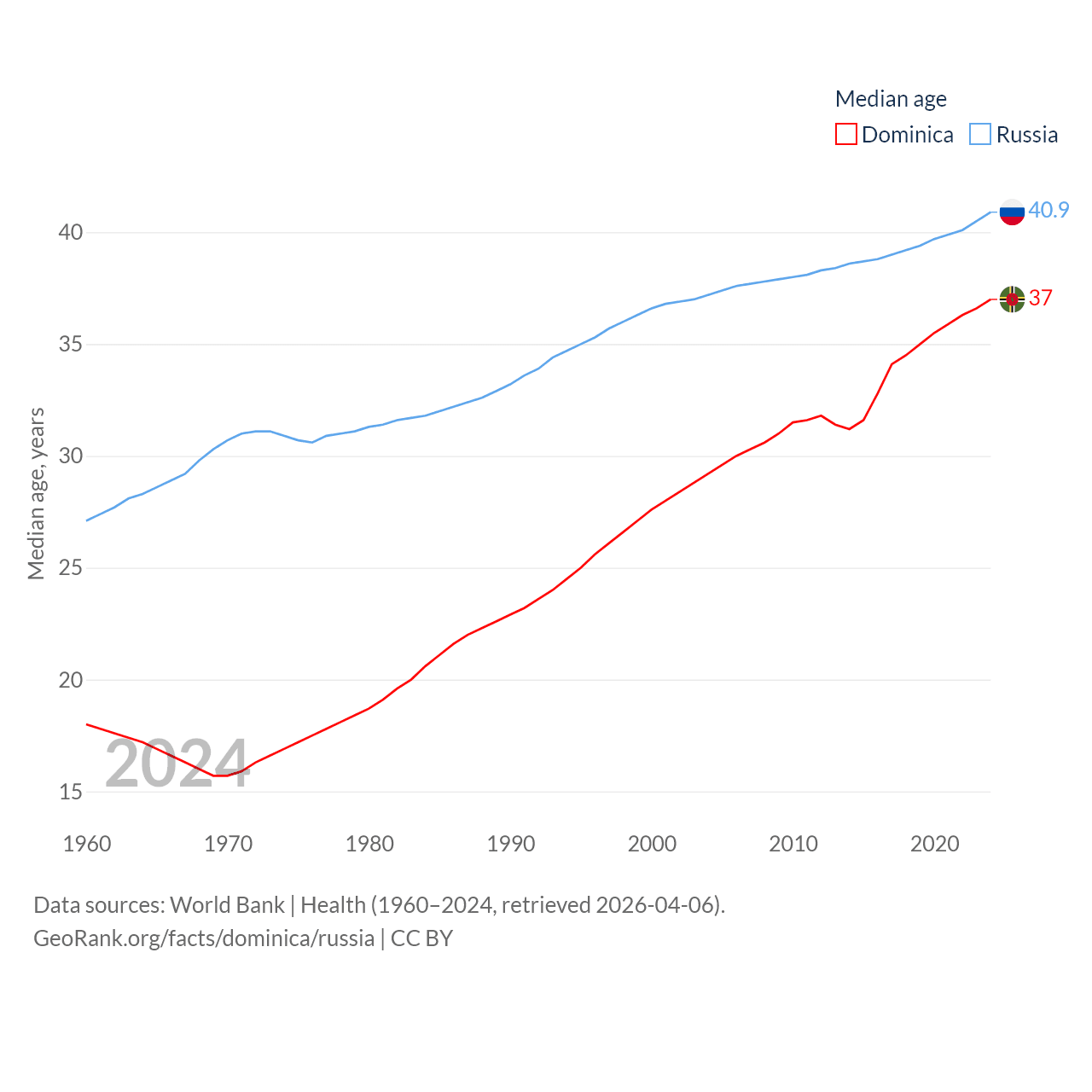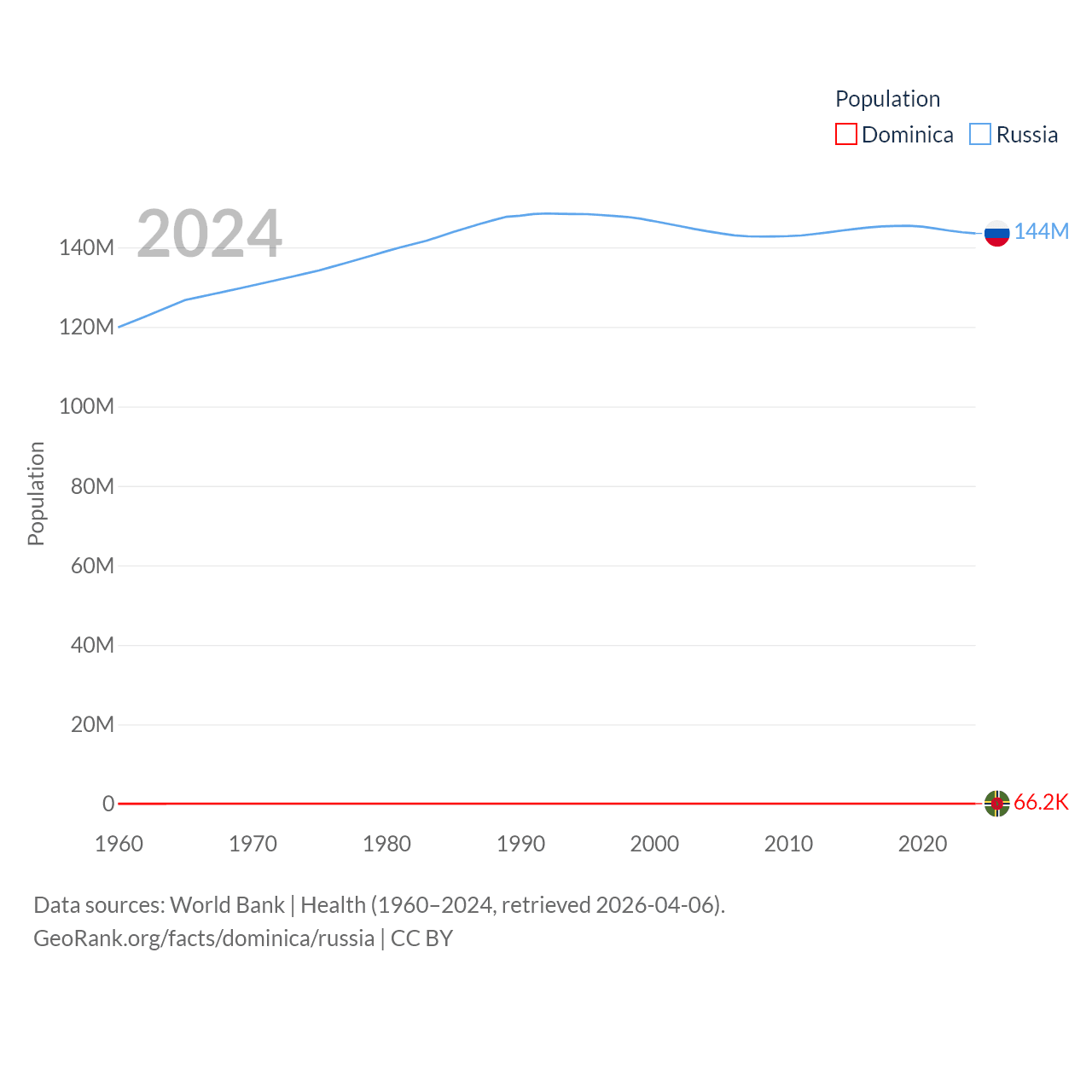 Dominica has a population of 66.2K (ranked 188/197), compared with 144M in Russia (ranked 9/197). Dominica's land area is 289.6 sq mi versus 6,323,145 sq mi for Russia (ranked 175th vs. 1st).