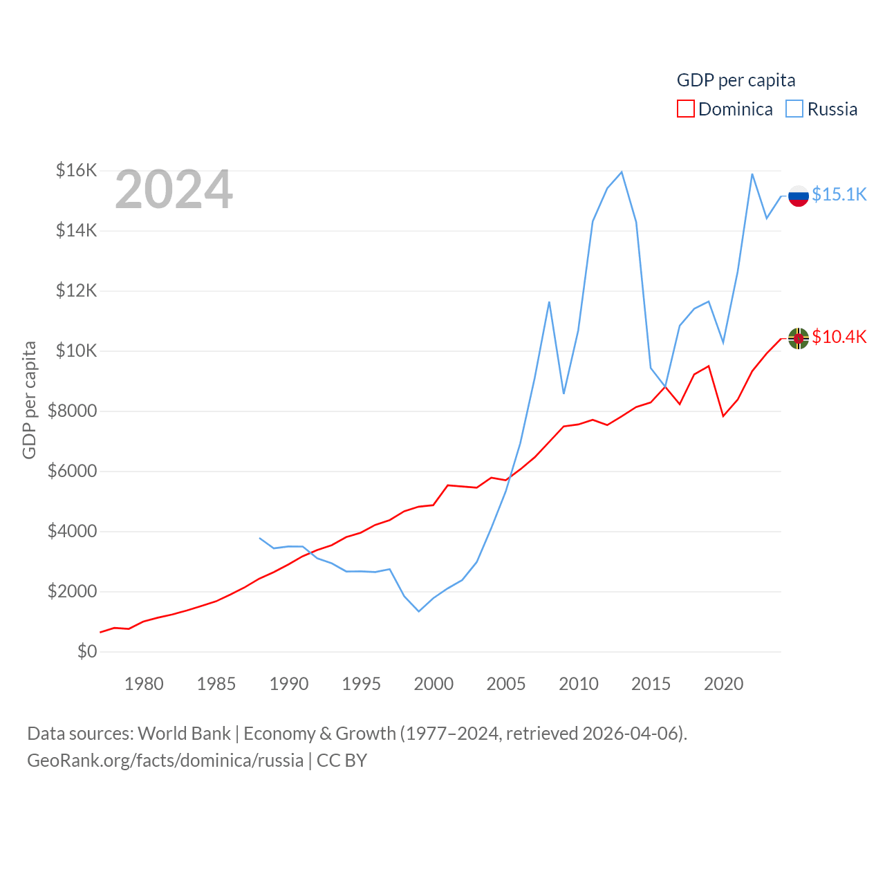 By GDP, Dominica ranks 190/197 ($689M) and Russia ranks 11/197 ($2.17T). By GDP per capita, Dominica ranks 84/197 ($10,405), while Russia ranks 68/197 ($15,145).