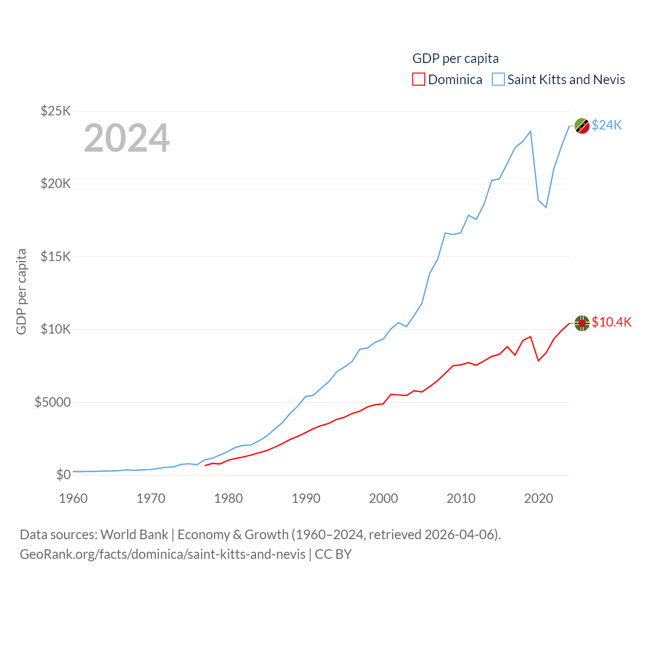 By GDP, Dominica ranks 190/197 ($689M) and Saint Kitts and Nevis ranks 187/197 ($1.12B). By GDP per capita, Dominica ranks 84/197 ($10,405), while Saint Kitts and Nevis ranks 51/197 ($23,961).