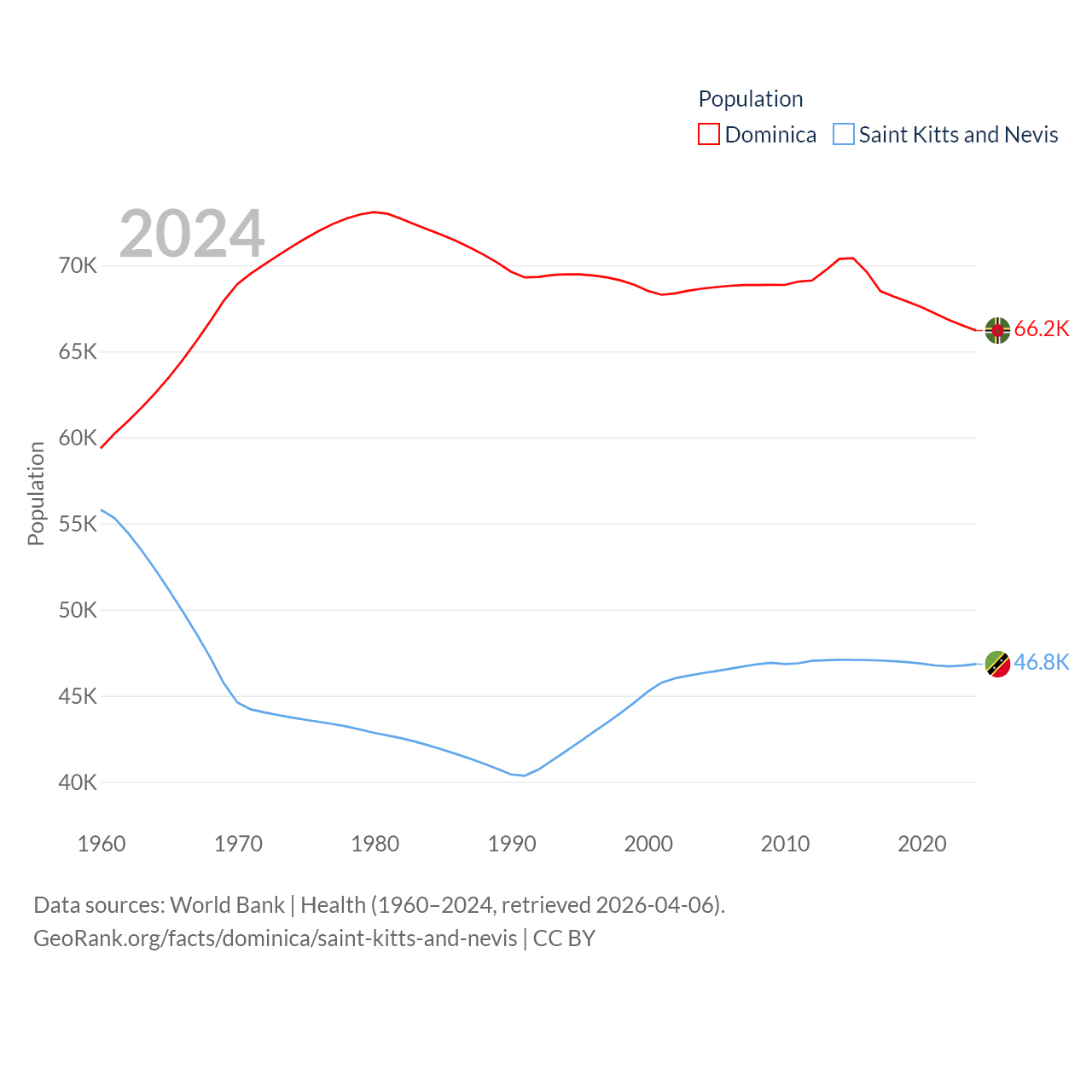 Dominica has a population of 66.2K (ranked 188/197), compared with 46.8K in Saint Kitts and Nevis (ranked 189/197). Dominica's land area is 289.6 sq mi versus 100.4 sq mi for Saint Kitts and Nevis (ranked 175th vs. 189th).