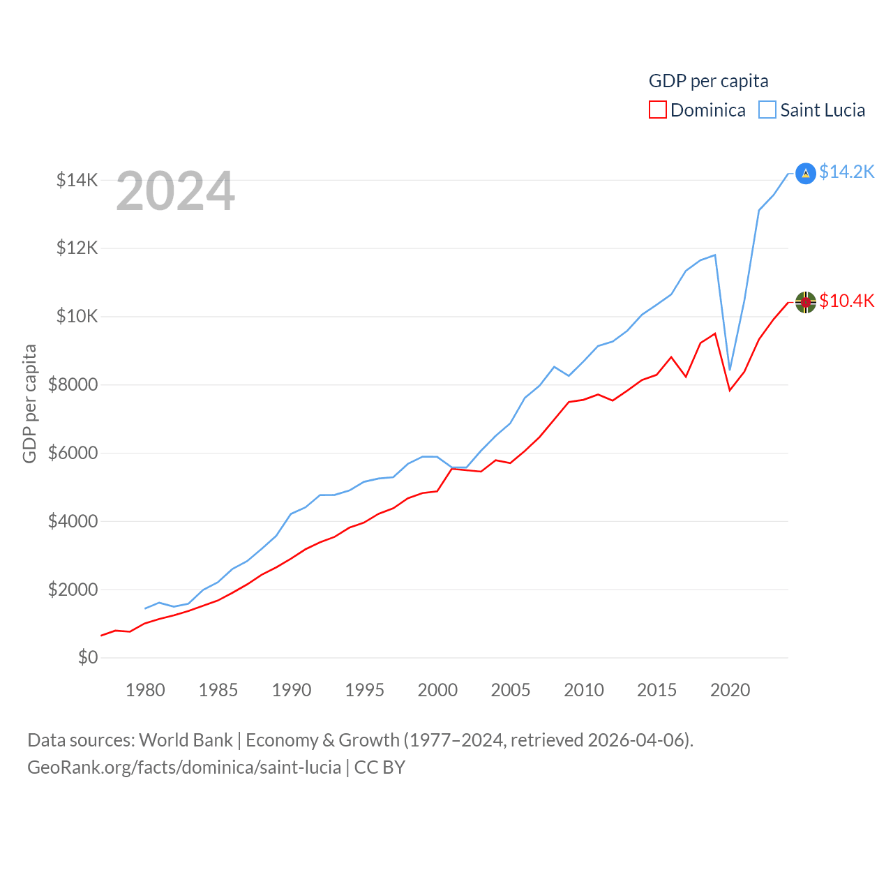 By GDP, Dominica ranks 190/197 ($689M) and Saint Lucia ranks 173/197 ($2.55B). By GDP per capita, Dominica ranks 84/197 ($10,405), while Saint Lucia ranks 70/197 ($14,182).