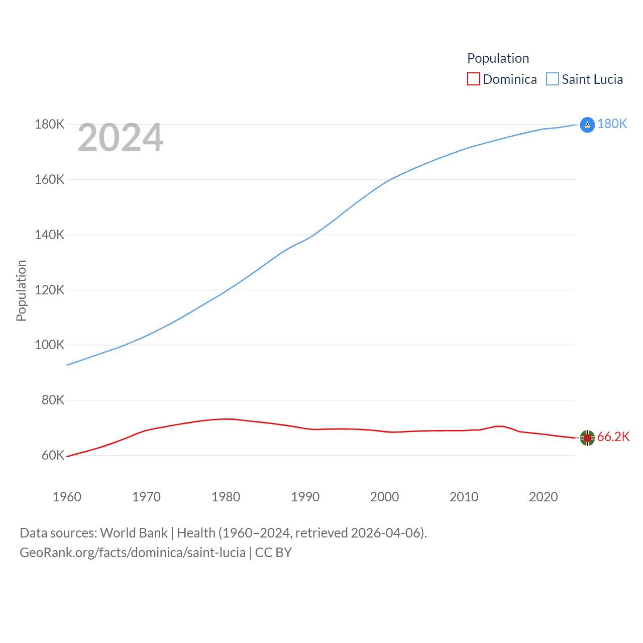 Dominica has a population of 66.2K (ranked 188/197), compared with 180K in Saint Lucia (ranked 178/197). Dominica's land area is 289.6 sq mi versus 235.5 sq mi for Saint Lucia (ranked 175th vs. 178th).