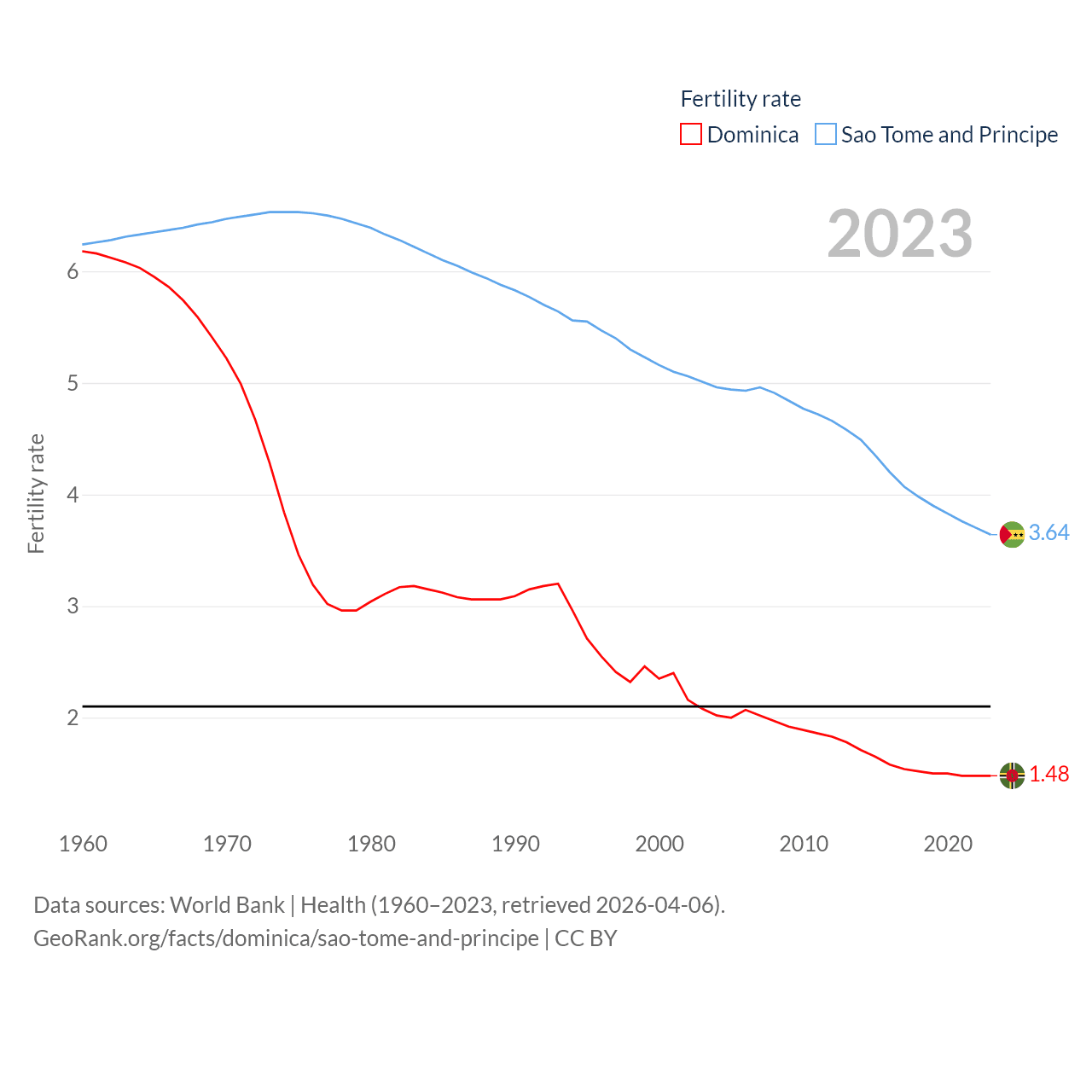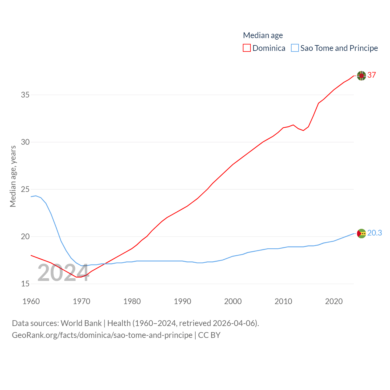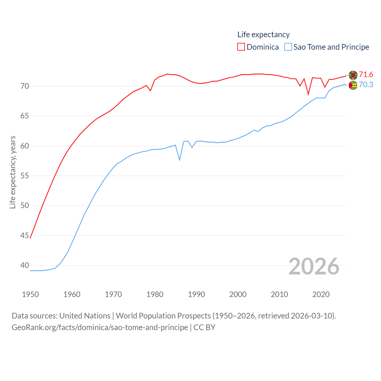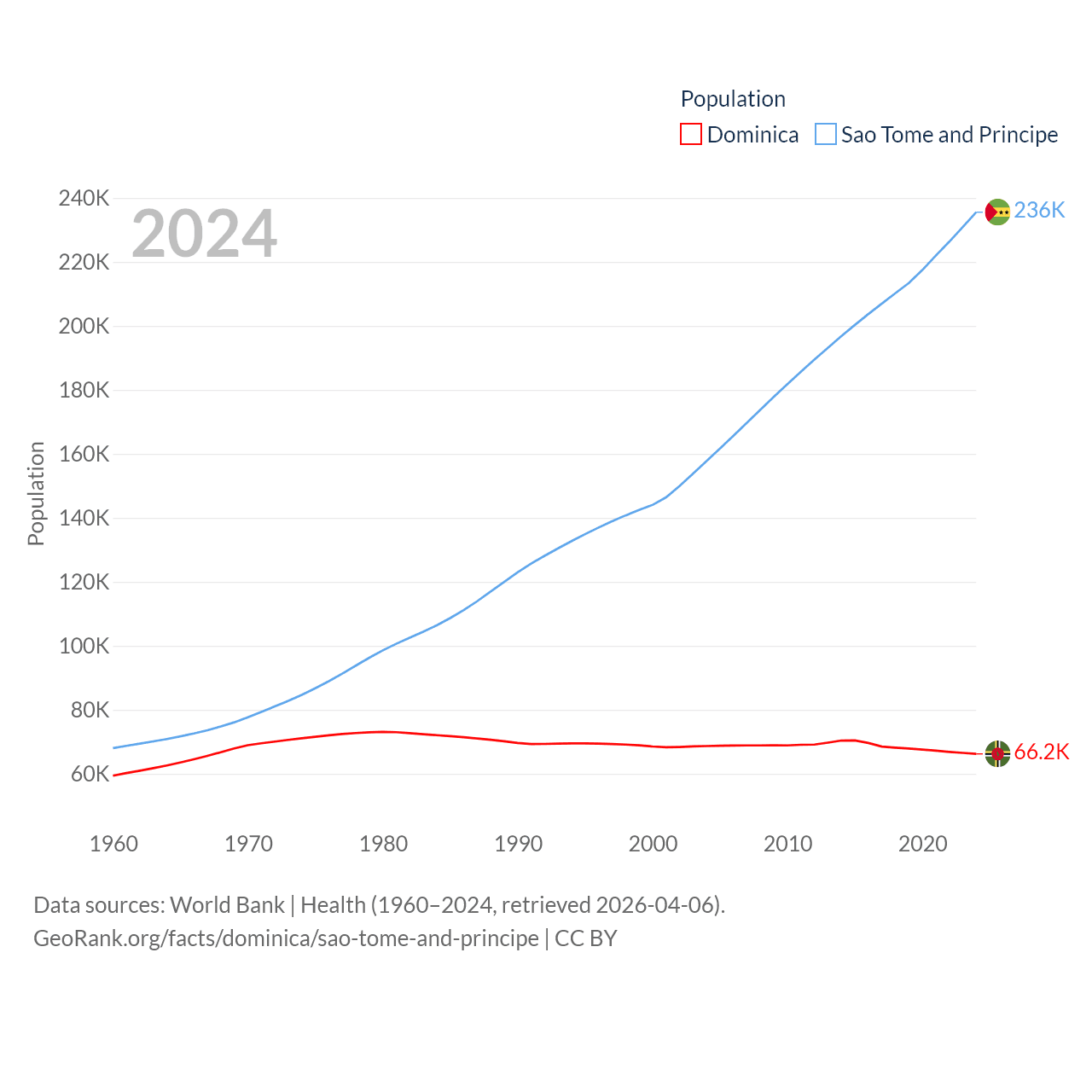 Dominica has a population of 66.2K (ranked 188/197), compared with 236K in Sao Tome and Principe (ranked 176/197). Dominica's land area is 289.6 sq mi versus 371 sq mi for Sao Tome and Principe (ranked 175th vs. 172nd).