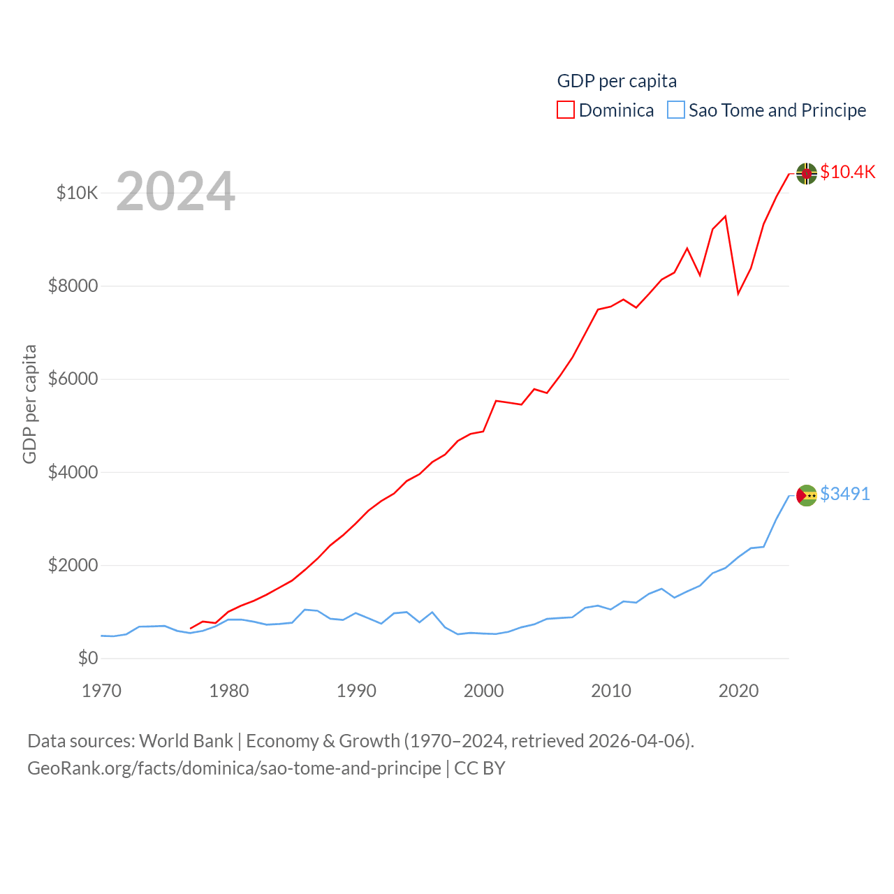 By GDP, Dominica ranks 190/197 ($689M) and Sao Tome and Principe ranks 189/197 ($822M). By GDP per capita, Dominica ranks 84/197 ($10,405), while Sao Tome and Principe ranks 134/197 ($3,491).