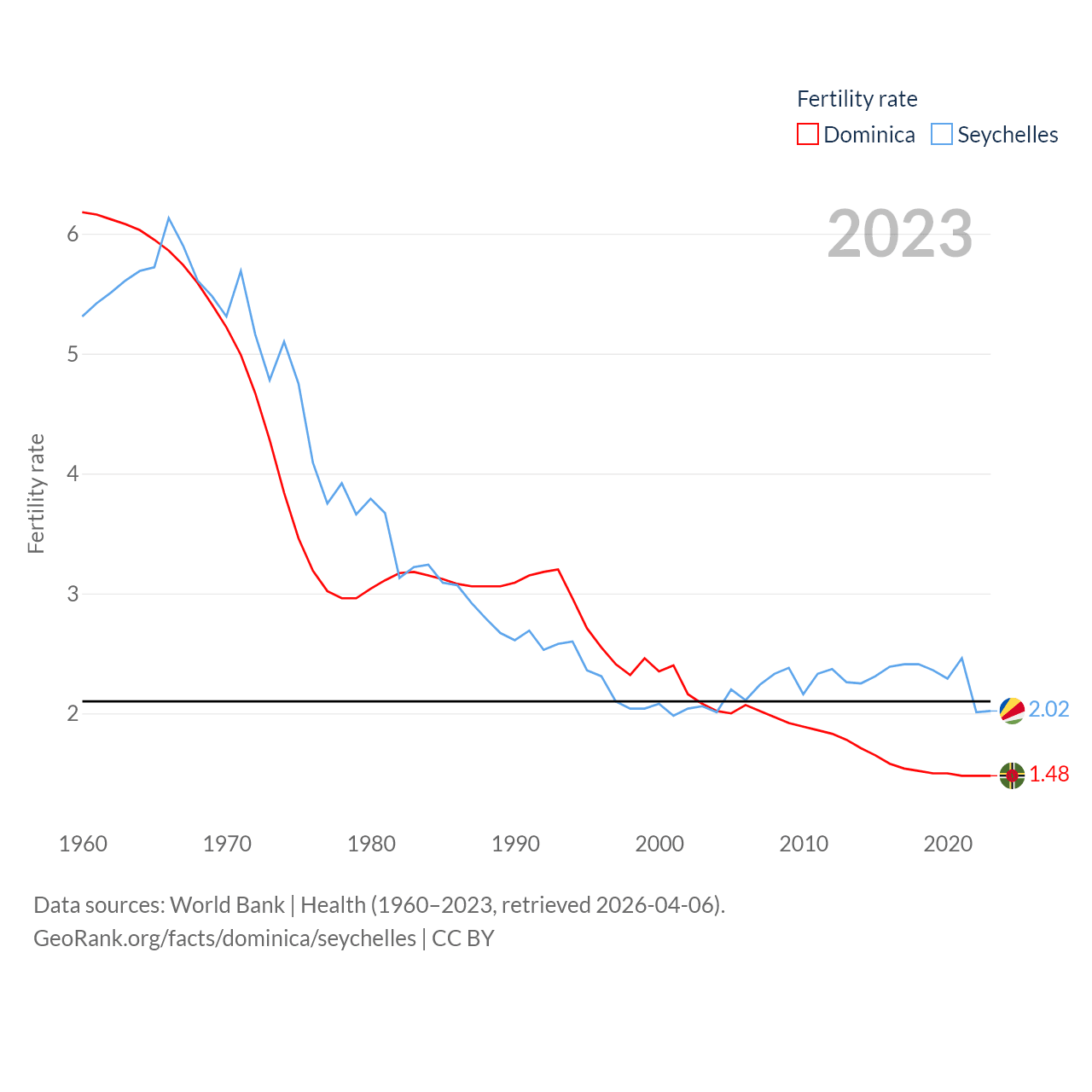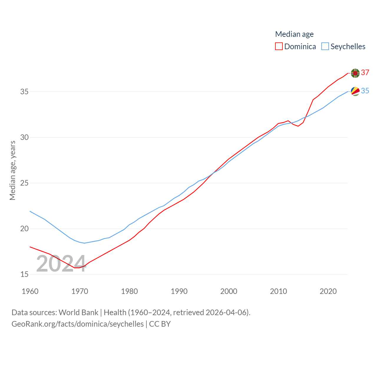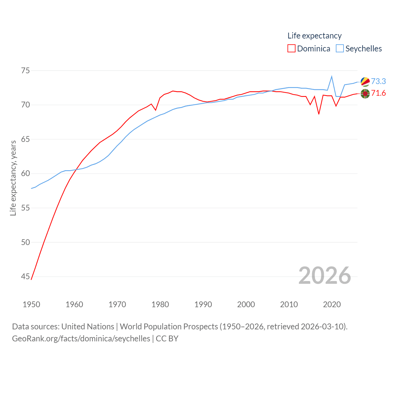 Dominica has a population of 66.2K (ranked 188/197), compared with 121K in The Seychelles (ranked 181/197). Dominica's land area is 289.6 sq mi versus 177.6 sq mi for The Seychelles (ranked 175th vs. 181st).