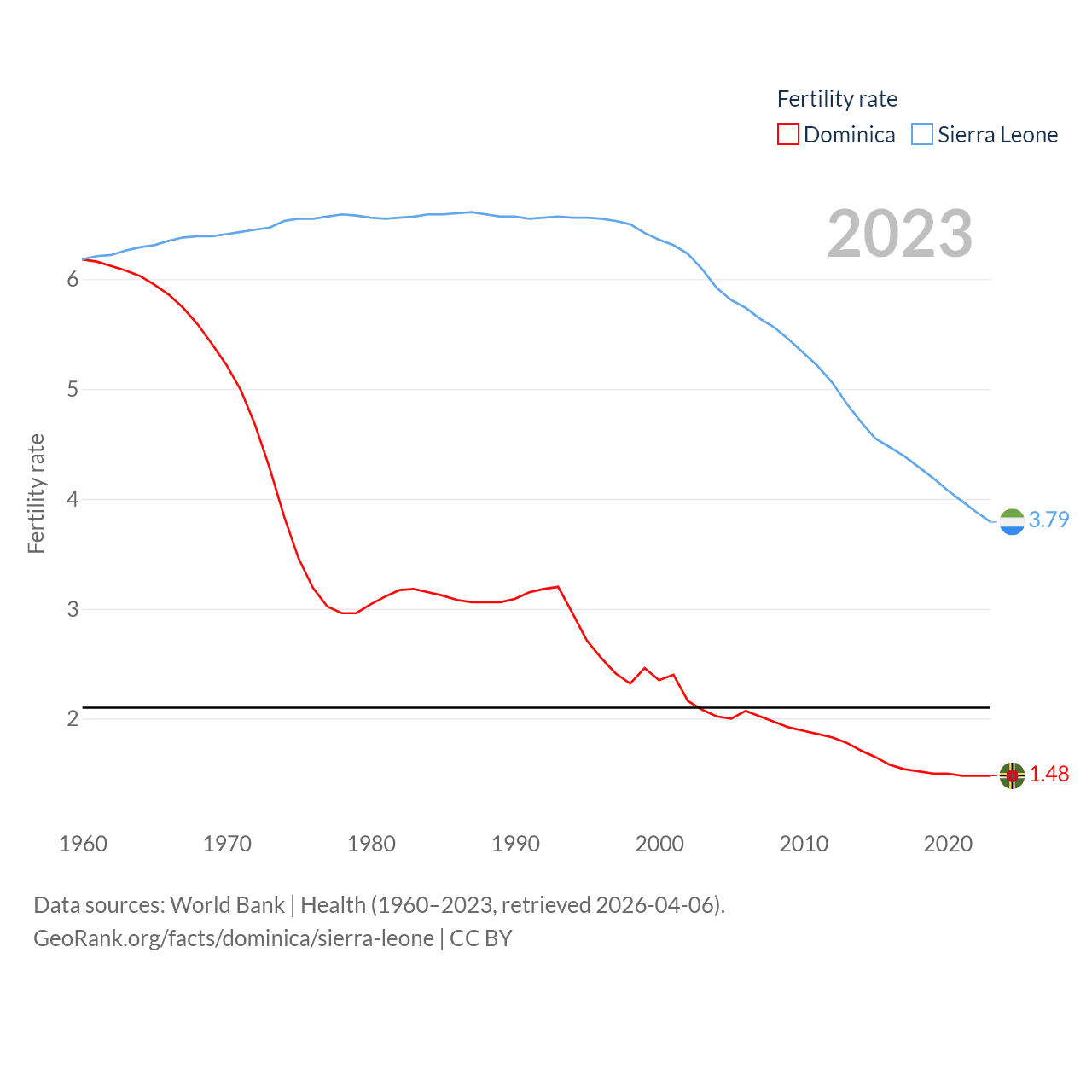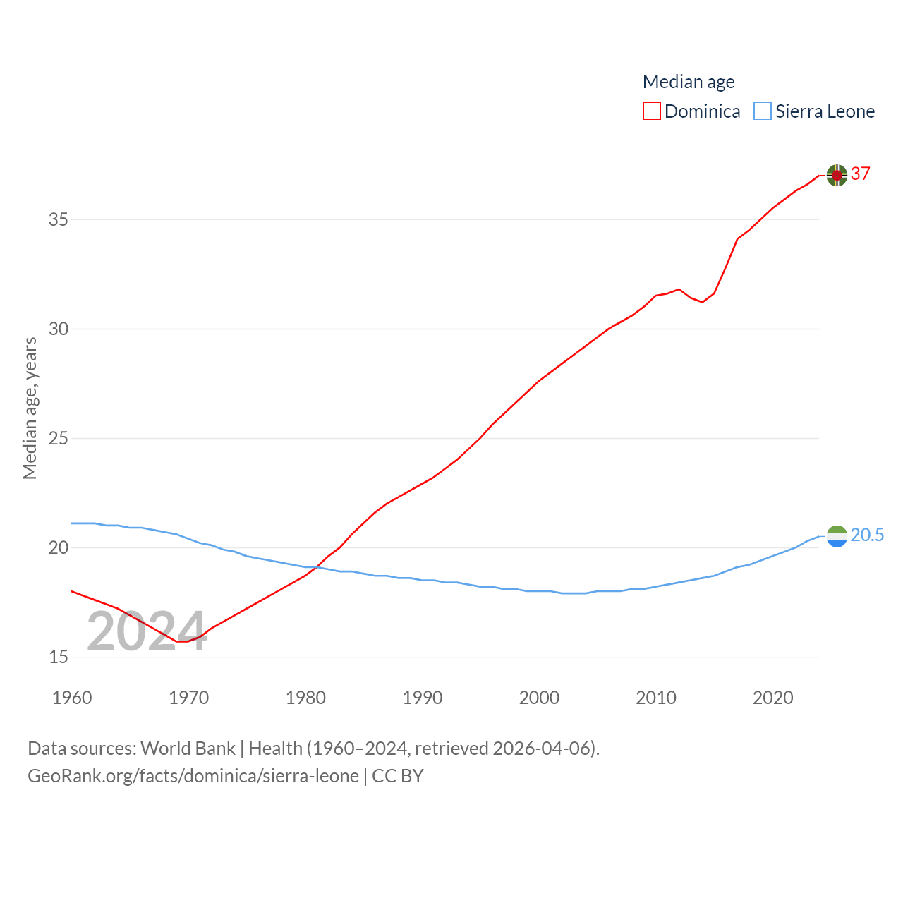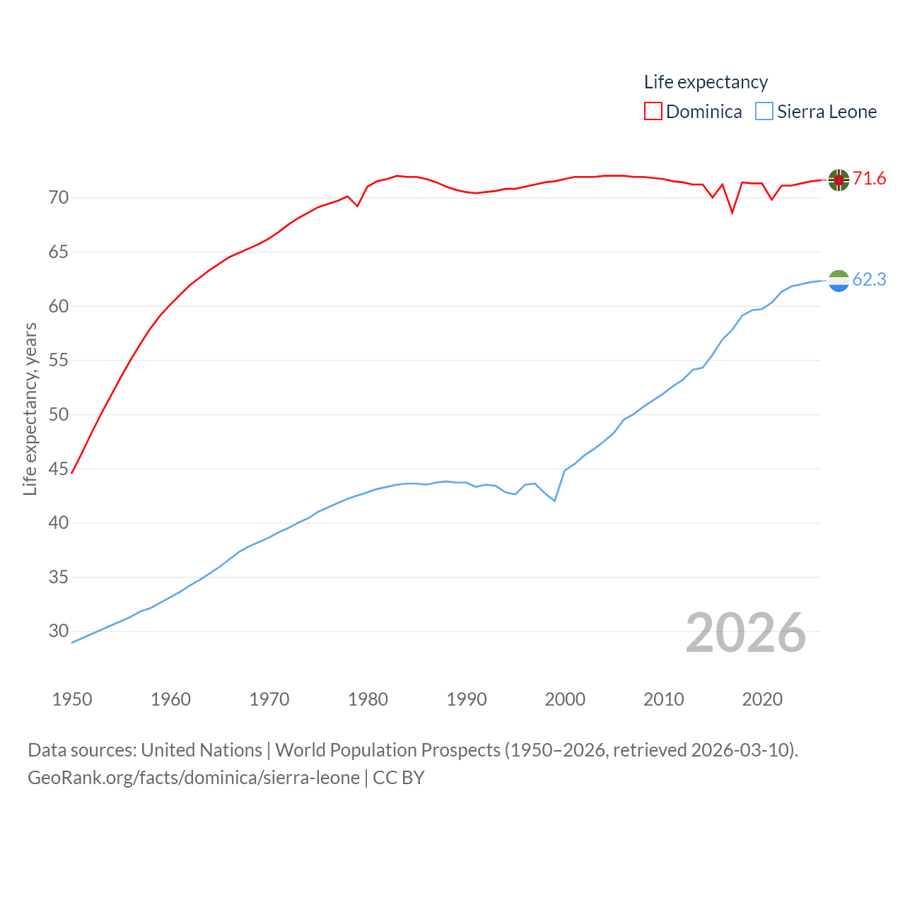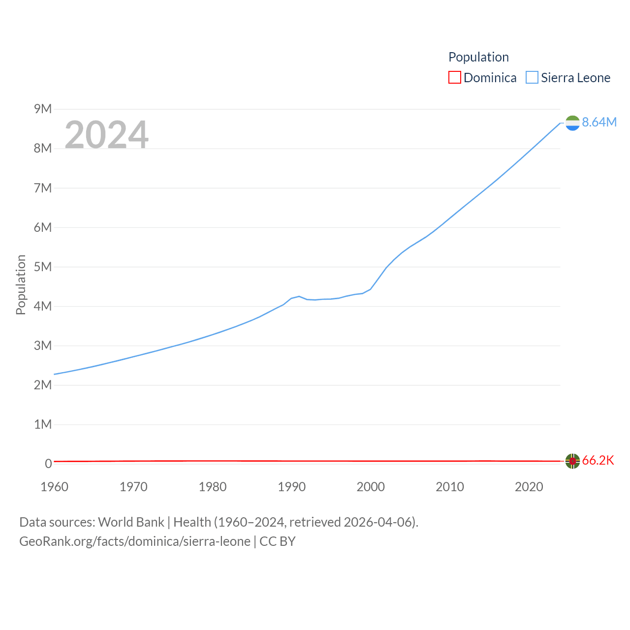 Dominica has a population of 66.2K (ranked 188/197), compared with 8.64M in Sierra Leone (ranked 102/197). Dominica's land area is 289.6 sq mi versus 27,869 sq mi for Sierra Leone (ranked 175th vs. 116th).
