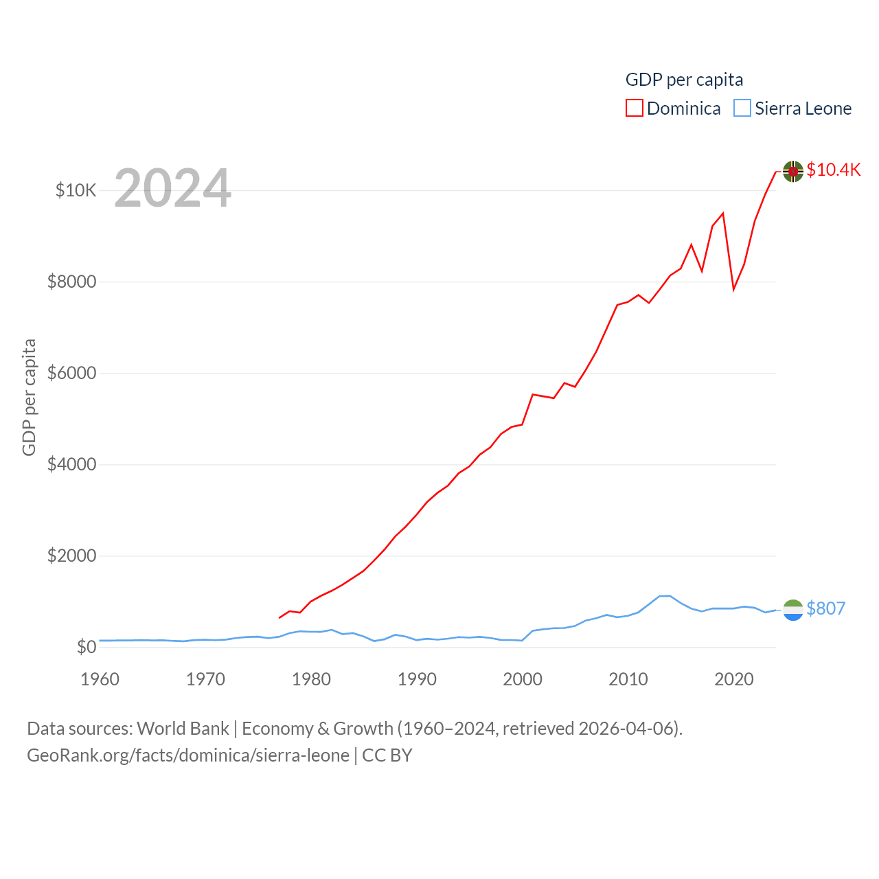 By GDP, Dominica ranks 190/197 ($689M) and Sierra Leone ranks 160/197 ($6.97B). By GDP per capita, Dominica ranks 84/197 ($10,405), while Sierra Leone ranks 186/197 ($807).