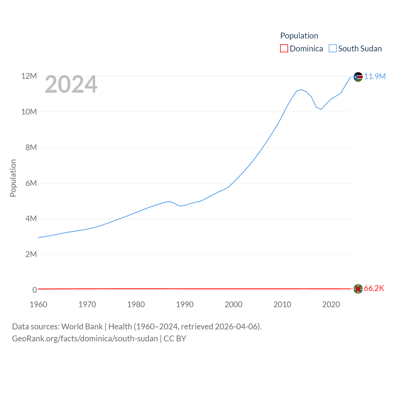 Dominica has a population of 66.2K (ranked 188/197), compared with 11.9M in South Sudan (ranked 81/197). Dominica's land area is 289.6 sq mi versus 243,990 sq mi for South Sudan (ranked 175th vs. 41st).