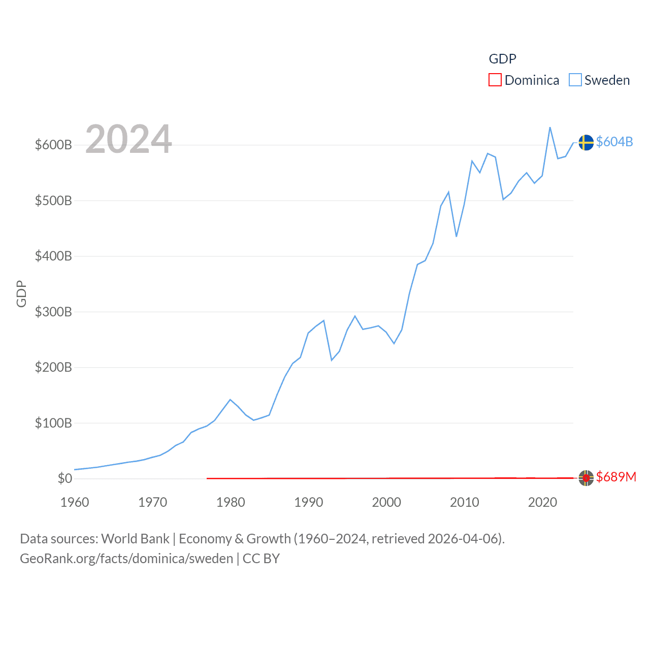 By GDP, Dominica ranks 190/197 ($689M) and Sweden ranks 26/197 ($604B). By GDP per capita, Dominica ranks 84/197 ($10,405), while Sweden ranks 17/197 ($57,117).