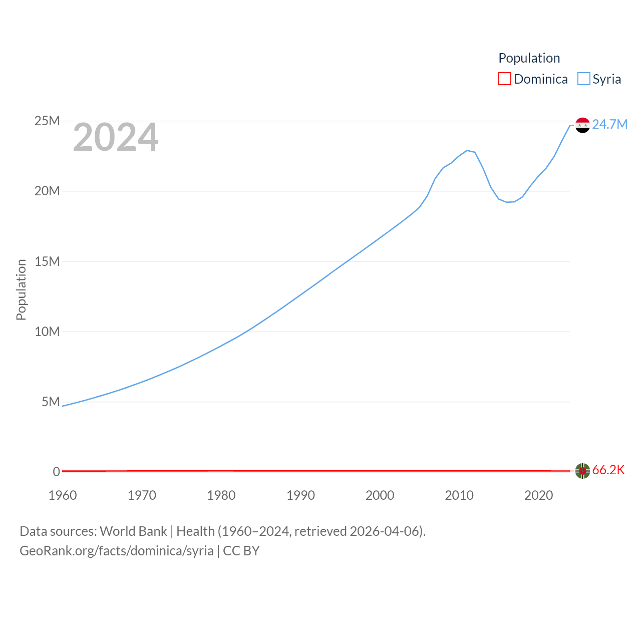 Dominica has a population of 66.2K (ranked 188/197), compared with 24.7M in Syria (ranked 57/197). Dominica's land area is 289.6 sq mi versus 70,900 sq mi for Syria (ranked 175th vs. 87th).